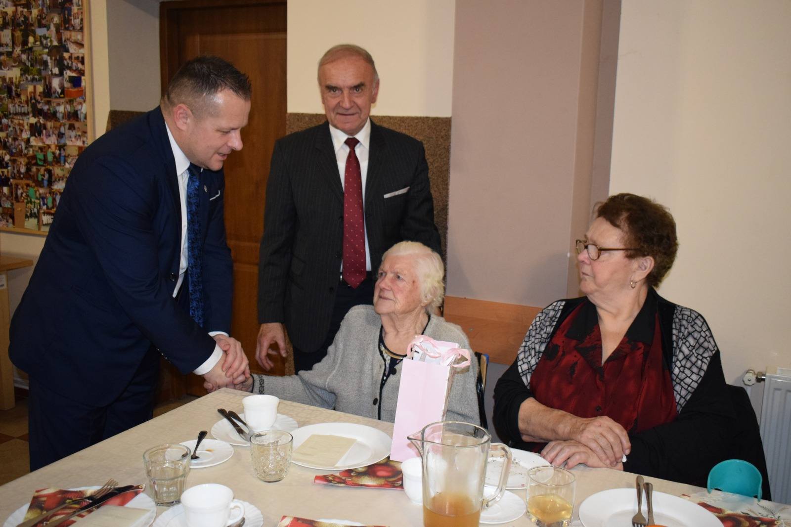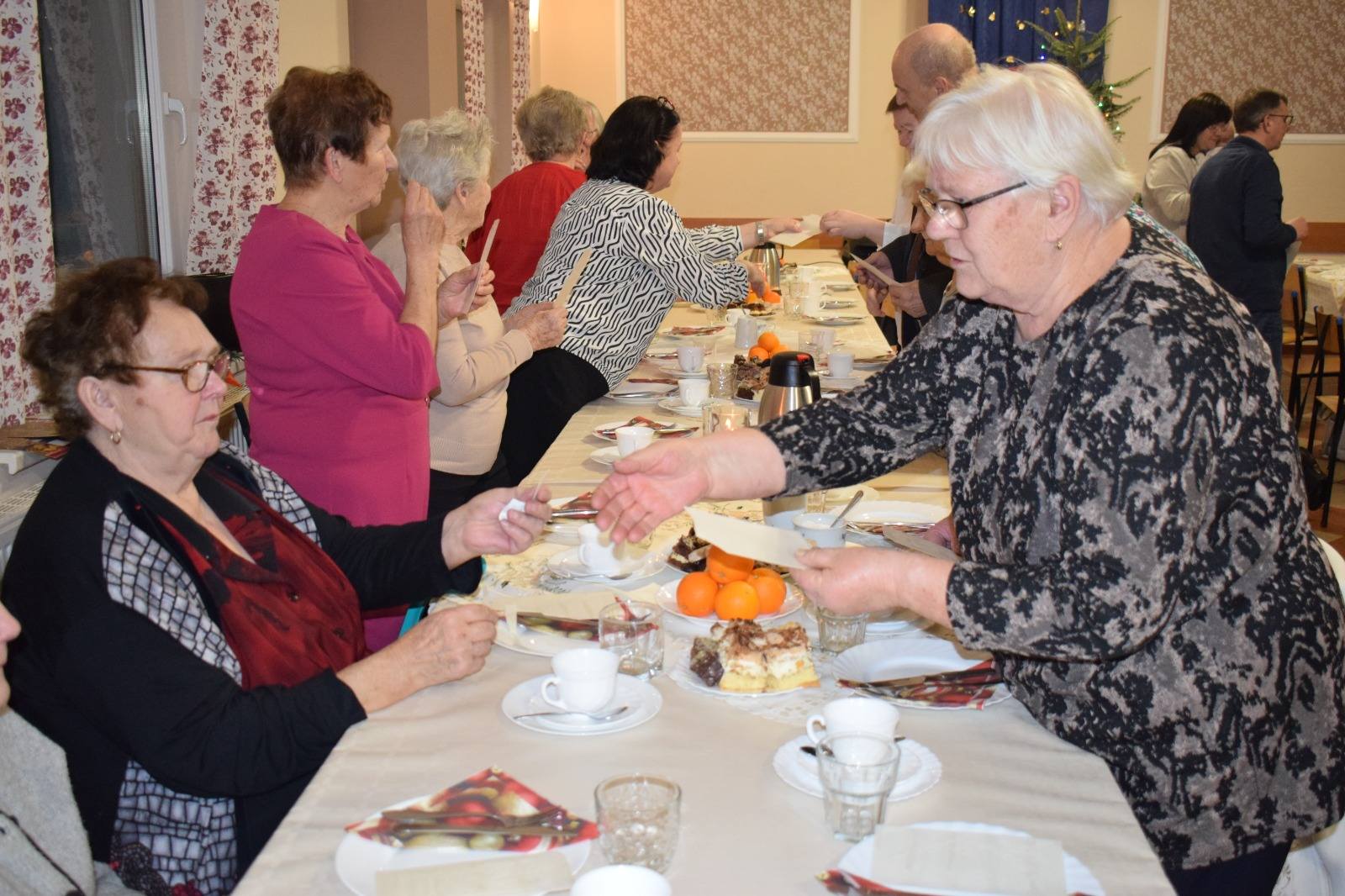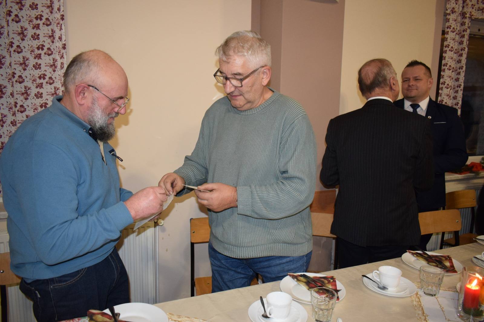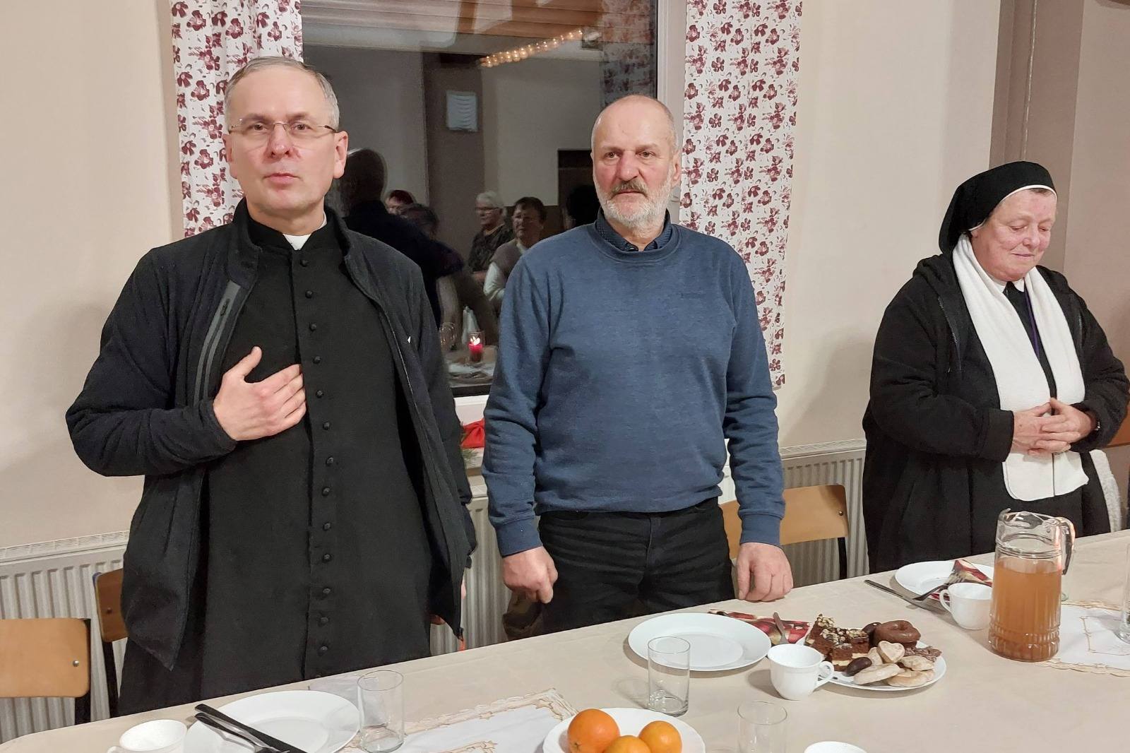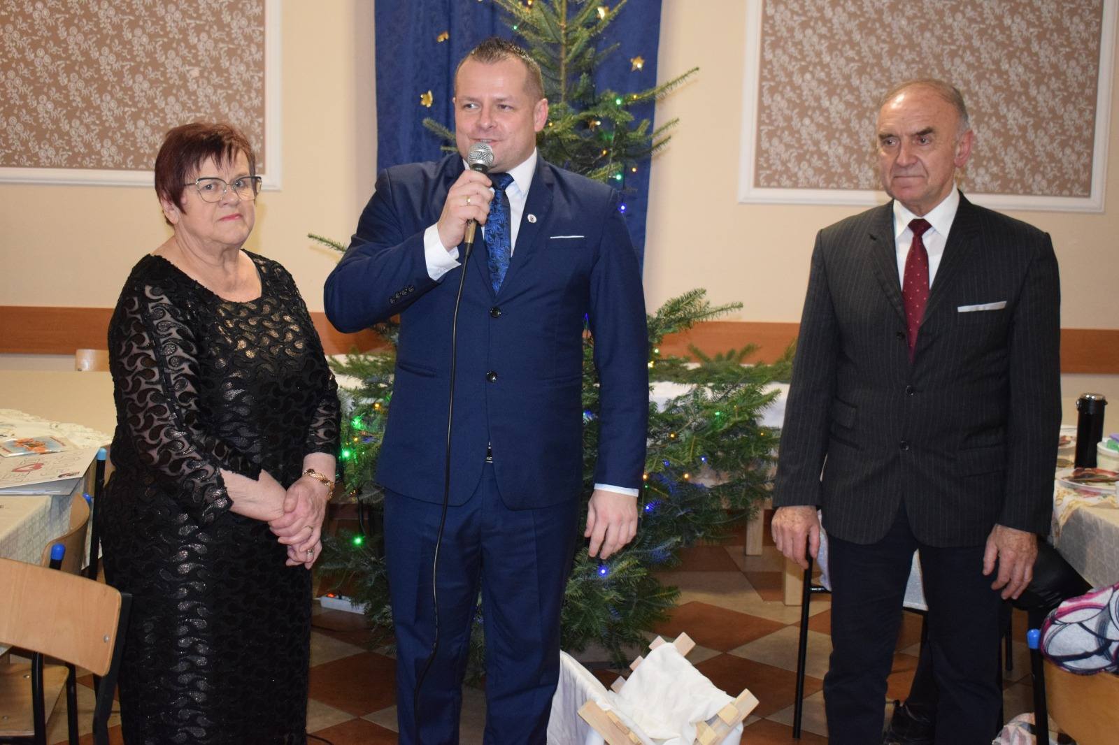 Uczestniczyli w nim również zaproszeni goście: Marcin Widera - Zastępca Burmistrza Ozimka, radny powiatowy Antoni Gryc oraz proboszcz parafii w Dylakach ks. Janusz Konofalski, którzy złożyli wszystkim świąteczno-noworoczne życzenia. Zastępca Burmistrza przekazał w prezencie kalendarze ścienne Gminy Ozimek na 2026 rok, wraz z serdecznymi życzeniami od Burmistrza Ozimka Mirosława Wieszołka, a po odczytaniu Ewangelii oraz modlitwie odmówionej przez księdza proboszcza, wszyscy zasiedli do wigilijnej wieczerzy złożonej z tradycyjnych potraw: czerwonego barszczu, ziemniaków, smażonej ryby, kapusty i kompotu.