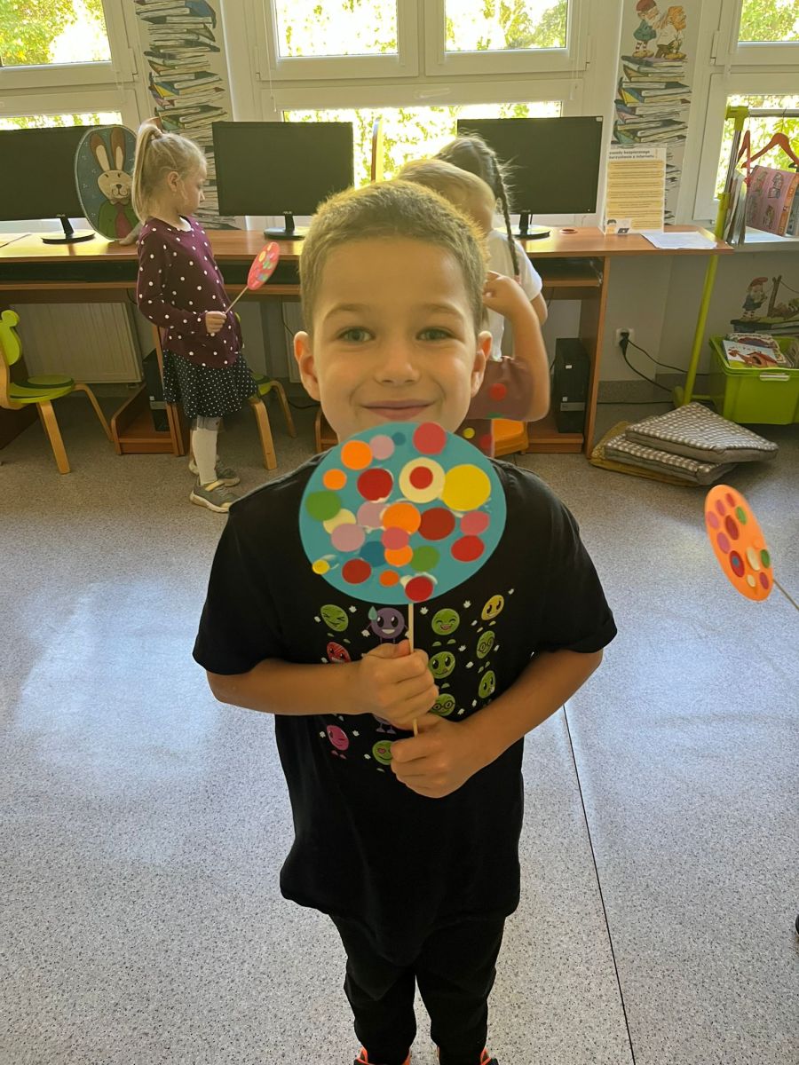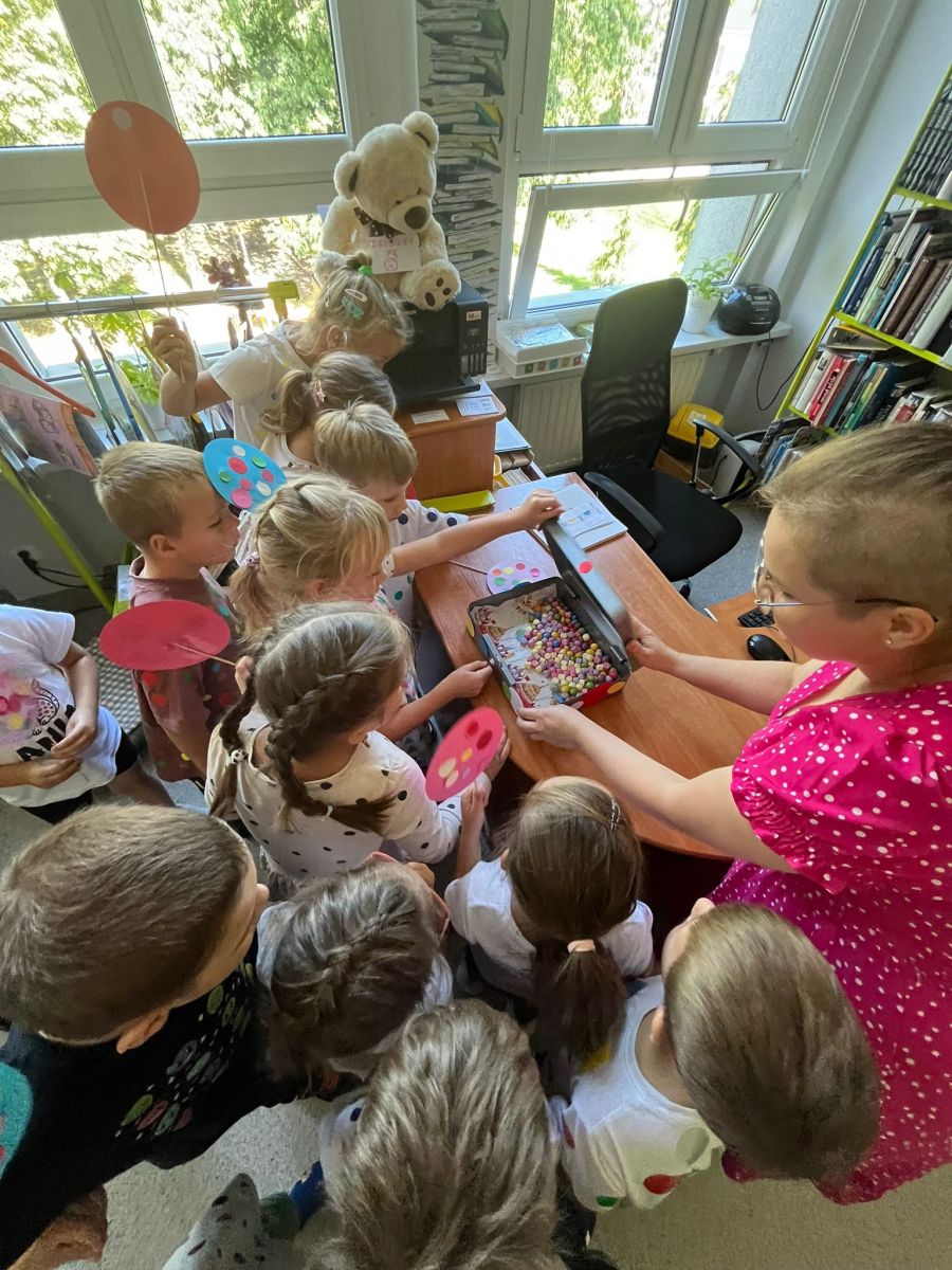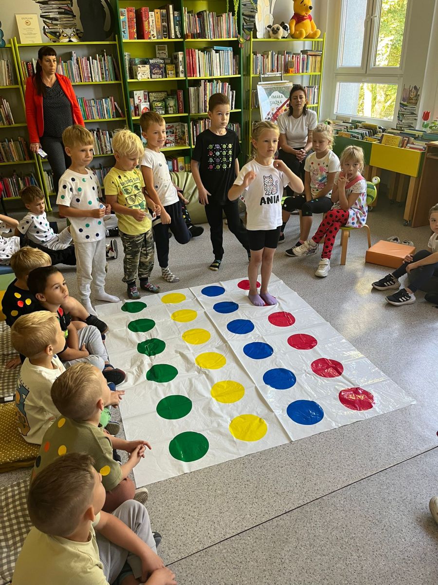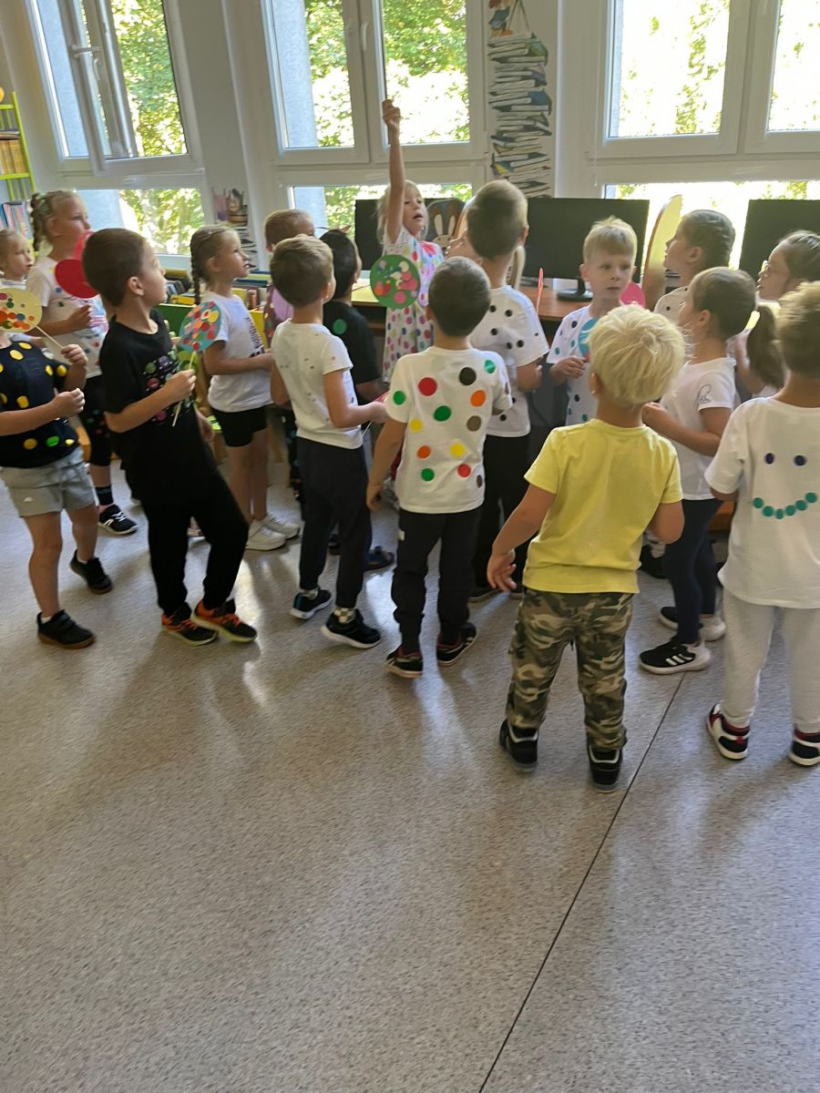 Przedszkolaki z Przedszkola Publicznego nr 1 w Ozimku grupa ,,Witaminki’’ wybrały się do Biblioteki Dziecięcej w Ozimku na zajęcia z okazji DNIA KROPKI gdzie spędziły bardzo miło czas. Inicjatorem tego święta jest Peter H. Reynolds autor książki: ,,The Dot” czyli ,,Kropka”, autor opowiada w niej historię małej dziewczynki Vashtii, która dzięki nauczycielce plastyki uwierzyła w siebie i poznała swój talent, a wszystko zaczęłosię…od malutkiej kropki. Hasłem towarzyszącym świętowaniu jest kreatywność zabawa i odwaga.Nie zabrakło tego również i w naszej bibliotece. Panie Magdalena Spyra –Trybulska i Ewa Domanasiewicz o to zadbały. Na początku dzieci wysłuchały książki pt.,,Nciśnij mnie” Tullet Herve. To książka ,którą trzeba przekręcać, na którą trzeba dmuchać, której trzeba klaskać. Następnie dzieci po wykonaniu różnych zadań musiały znaleźć kluczyk do skrzyni, gdzie czekała na nich słodka niespodzianka. Przedszkolaki rzucały kółkami na pachołki, skakały według podanego kodu na planszy z kropkami, nastepnie panie sprawdzały koncentrację dzieci poprzez ułożenie kolorowych piłeczek w kubeczkach zadaniem dzieci było odtworzenie zakrytego wzoru w pustych kubeczkach. Na koniec dzieci wykonały pracę plastyczną-okrągły lizak na patyku.Dziękujemy paniom za ich zaangażowanie, kreatywność i ciepłe przyjęcie. Podczas zajęć dzieci mogły odkrywać swoje talenty, rozwijać wyobraźnię, przełamywać nieśmiałość, a przede wszystkim miło spędziły czas. Już nie możemy doczekać się kolejnego zaproszenia.