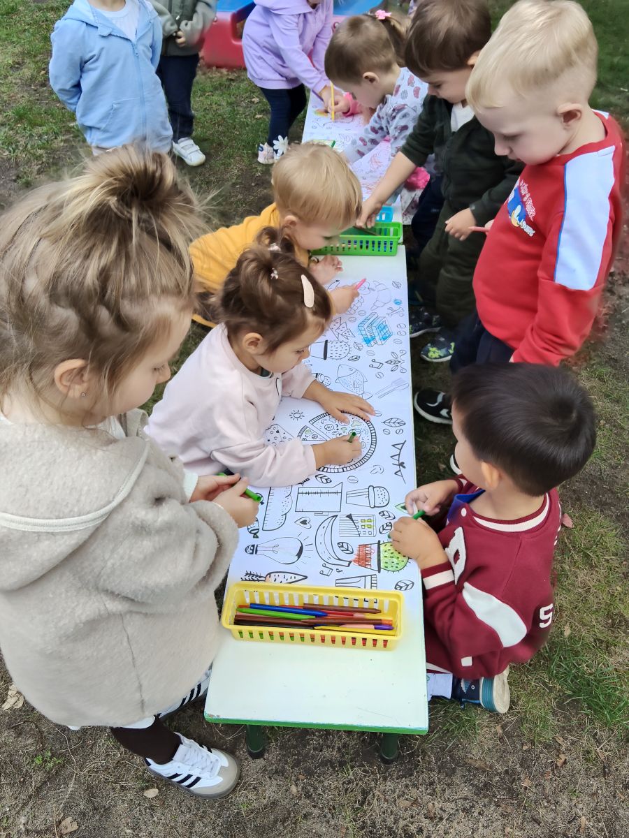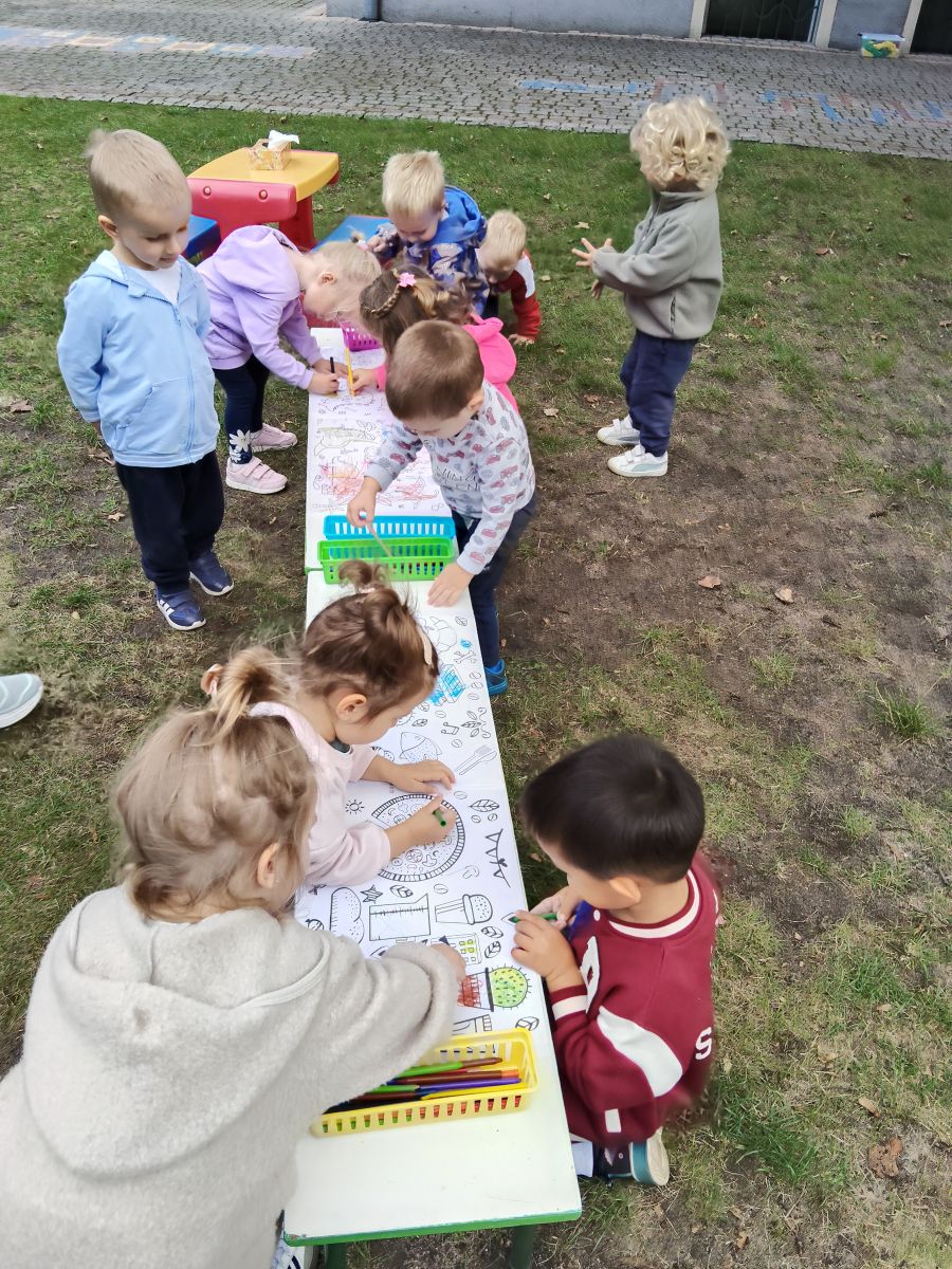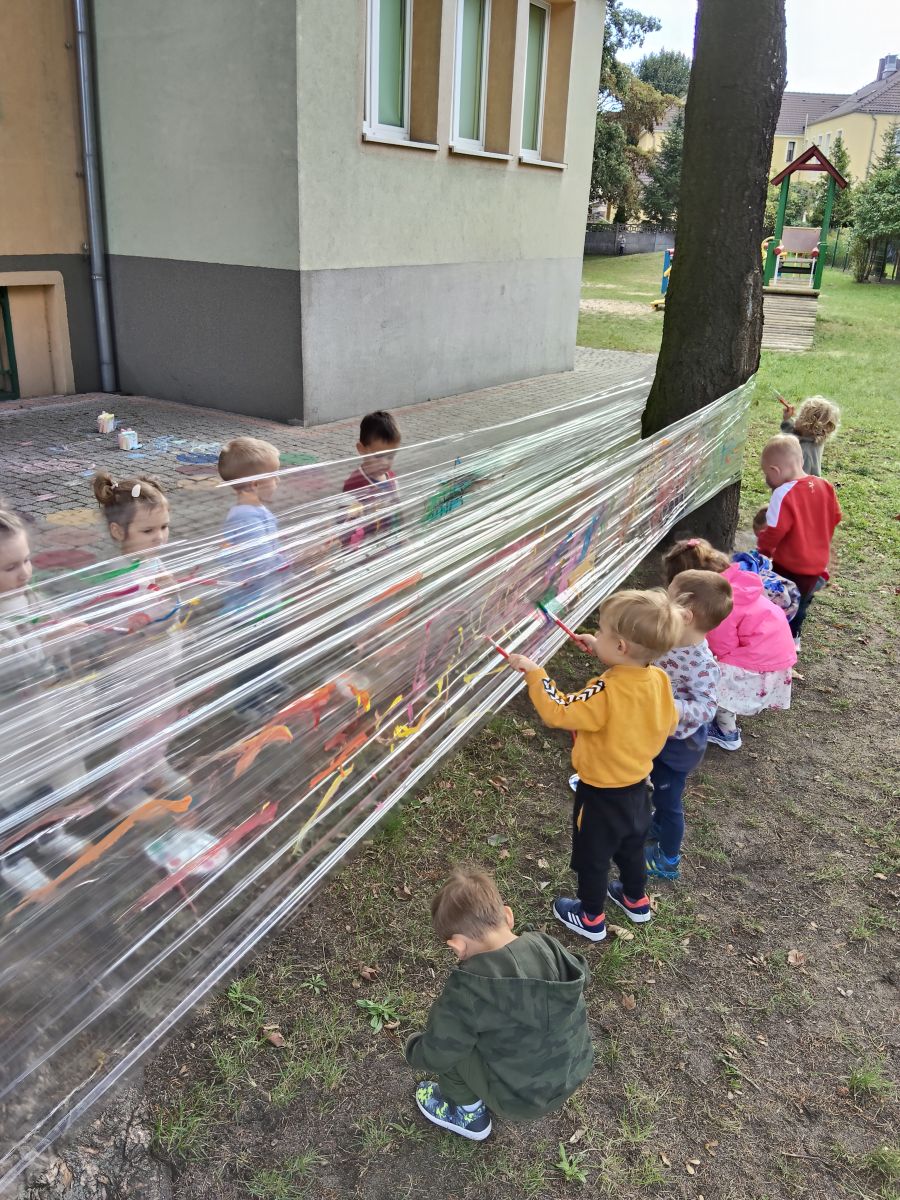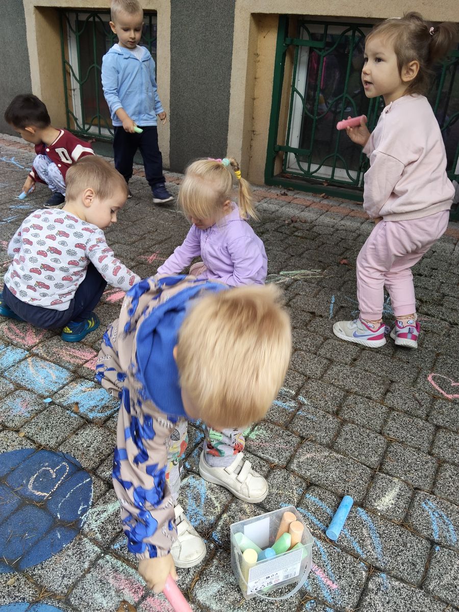 Po bajce nadszedł czas na zabawę na placu zabaw, który na ten dzień zamienił się w kolorową strefę atrakcji. Przedszkolaki mogły malować kredą po murze,