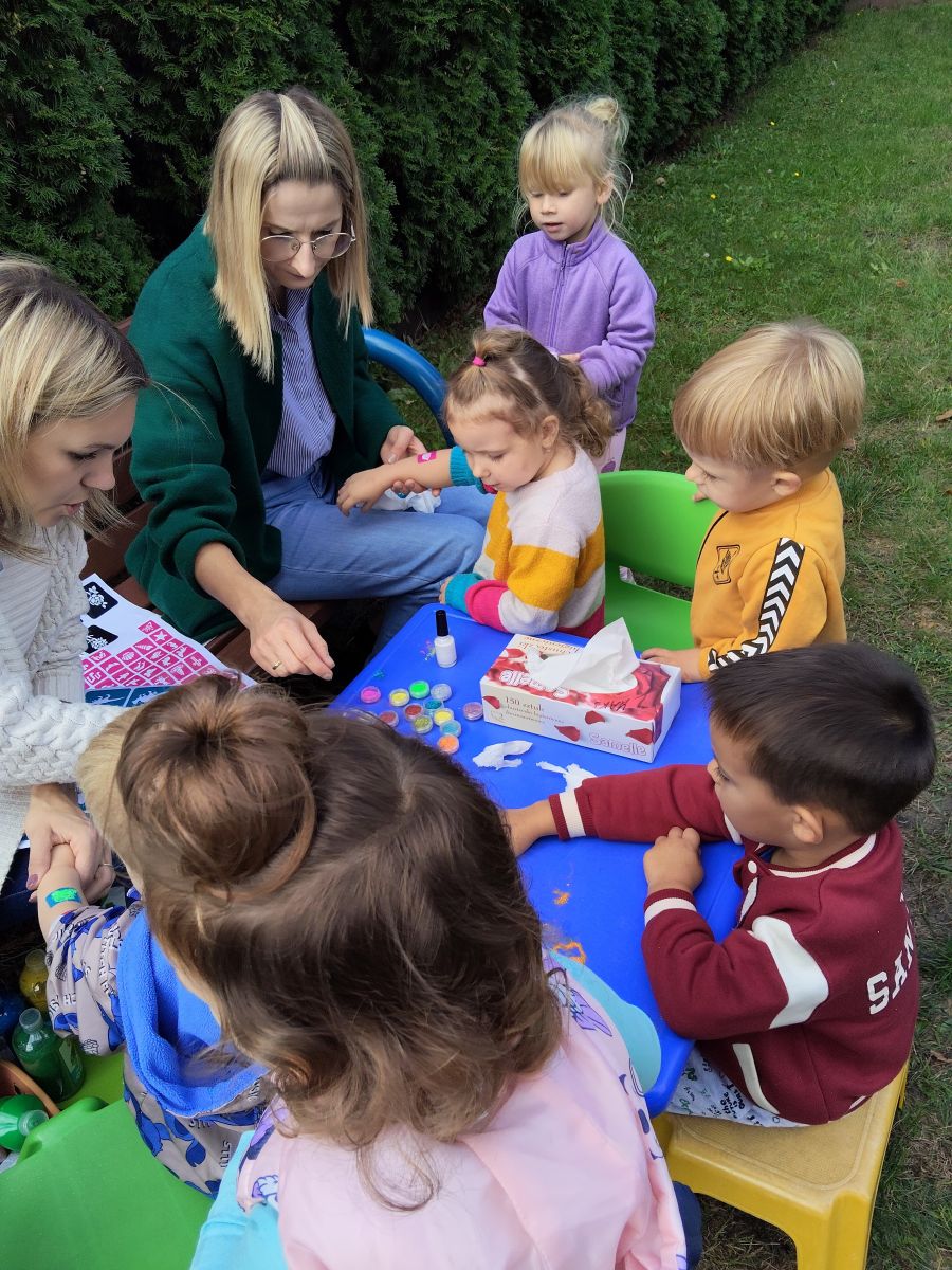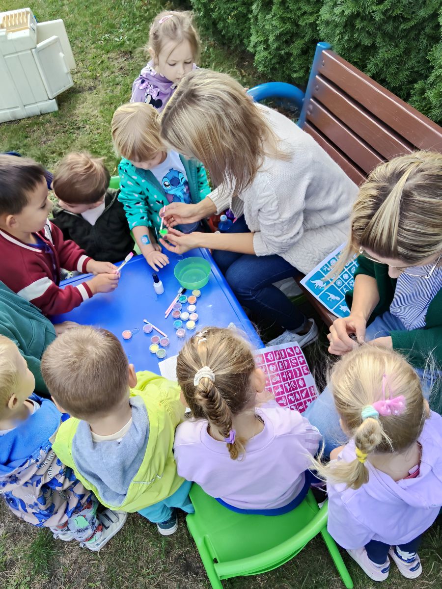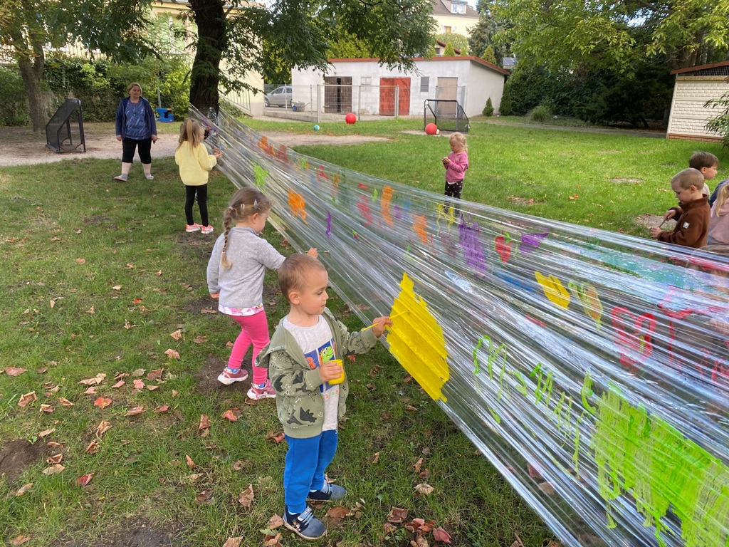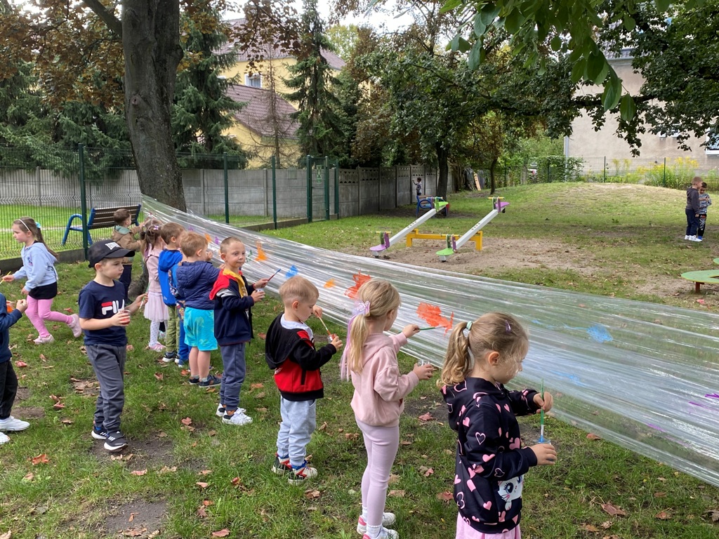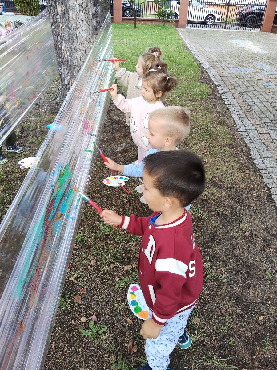 Po bajce nadszedł czas na zabawę na placu zabaw, który na ten dzień zamienił się w kolorową strefę atrakcji. Przedszkolaki mogły malować kredą po murze,