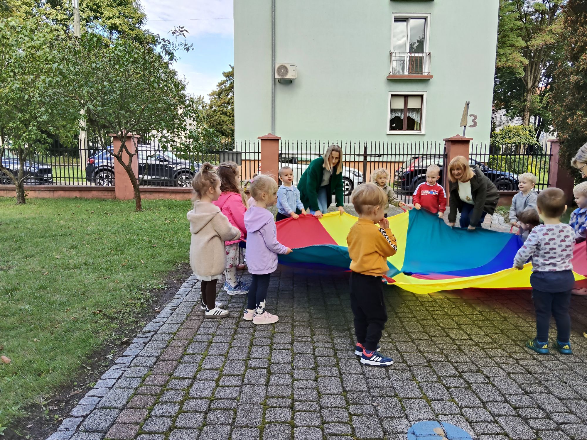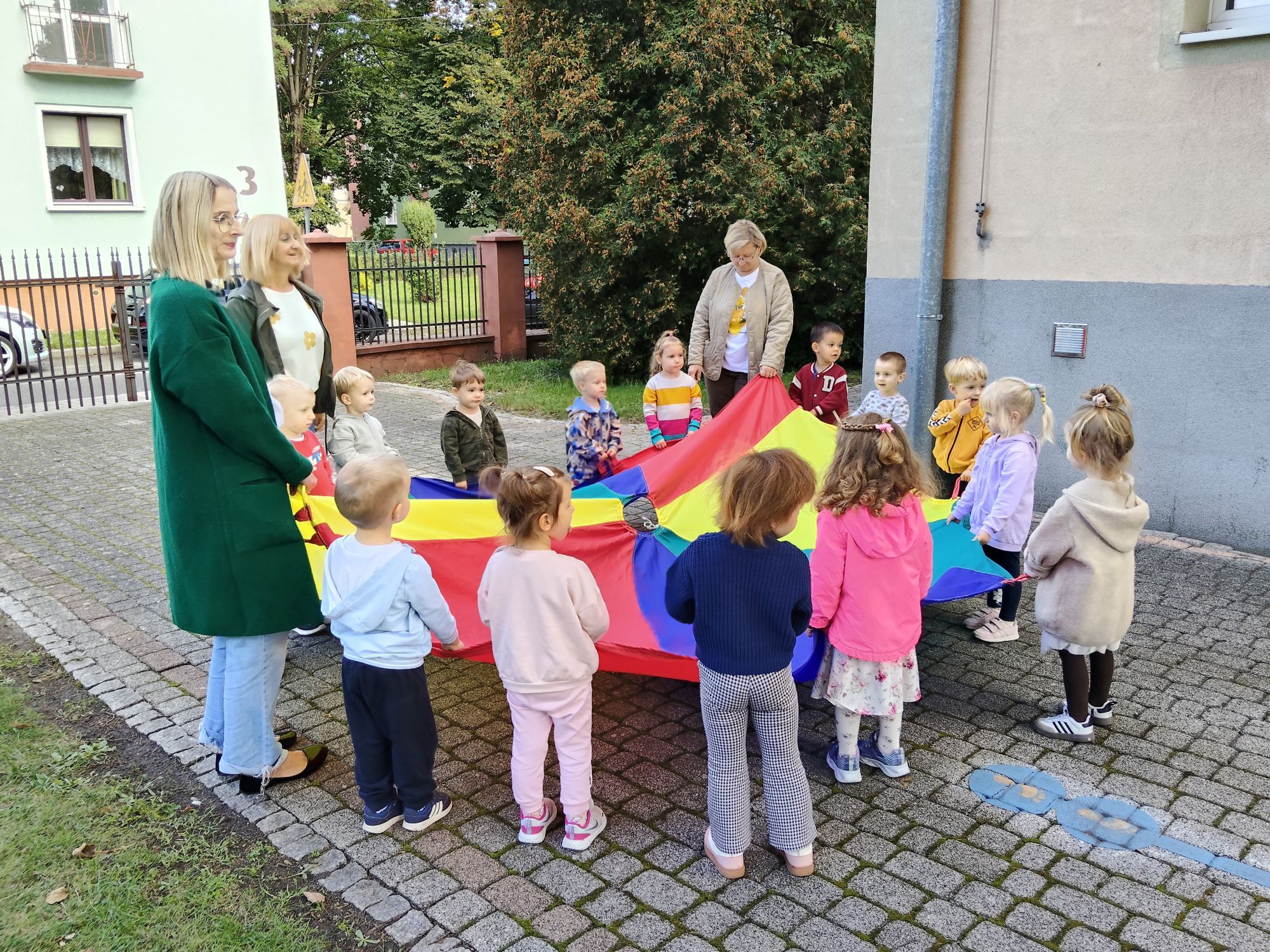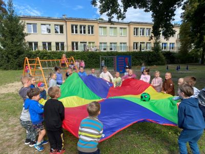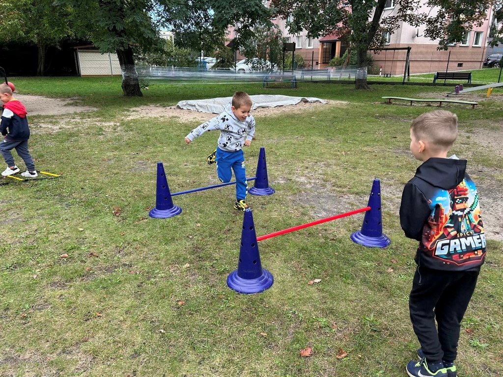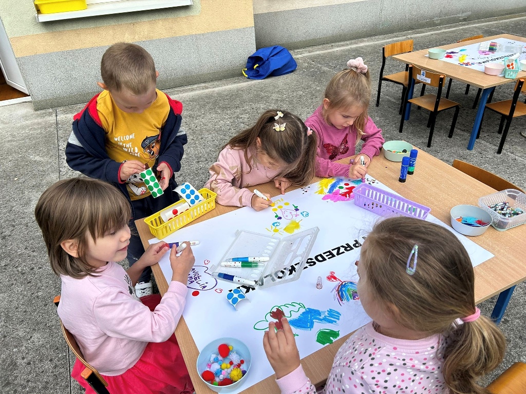Po bajce nadszedł czas na zabawę na placu zabaw, który na ten dzień zamienił się w kolorową strefę atrakcji. Przedszkolaki mogły malować kredą po murze,