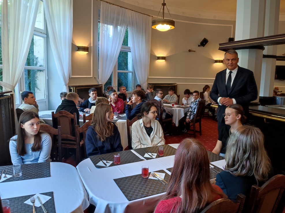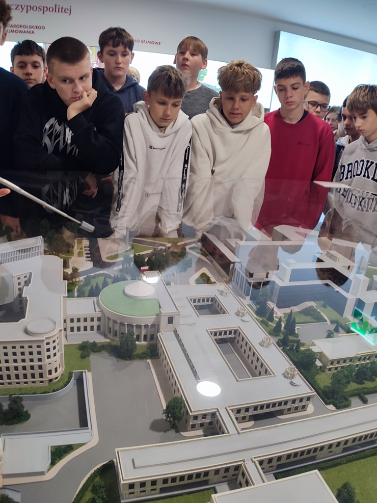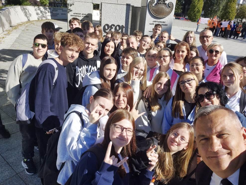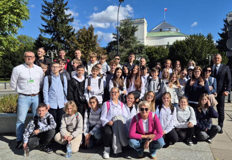 Do Sejmu RP 24 września br. pojechaliśmy na zaproszenie Posła na Sejm Tomasza Kostusia, a w tej niecodziennej wyprawie towarzyszył nam Burmistrz Ozimka Mirosław Wieszołek. Przed wejściem do budynku Sejmu zostaliśmy dokładnie sprawdzeni, a także nasze rzeczy przez wyszkolonych strażników. Historię Sejmu i parlamentaryzmu w Polsce opowiedziała nam przewodniczka, pokazując wielką makietę kompleksu Sejmu i Senatu. Nasza grupa uczniów klas siódmej i ósmej z wychowawczyniami Patrycją Kuznowicz i Violettą Oliwą miała możliwość na żywo zobaczyć otwarcie obrad 41. posiedzenia Sejmu RP X kadencji poprzez trzykrotne uderzenie laską marszałkowską przez Marszałka Sejmu. Ta laska ma znaczenie historyczne i jest symbolem godności urzędu Marszałka. Kolejnym niecodziennym momentem naszej wycieczki było powitanie uczniów z JEDYNKI włącznie z Panem Burmistrzem przez Wicemarszałka Sejmu. Byliśmy także świadkami głosowania posłów, którego wyniki błyskawicznie pokazały się na wielkich monitorach. Sala sejmowa okazała się ogromna i zrobiła na uczniach duże wrażenie. Posłowie, którzy do tej pory byli znani wyłącznie z telewizji, mijali nas na sejmowych korytarzach i z sympatią rozmawiali z nami. Nasz gospodarz, Poseł Tomasz Kostuś, opowiadał o swojej pracy, o obowiązkach poselskich, a także przekazał wiele interesujących ciekawostek. Pokazał nam też ciekawe miejsca w Sejmie, np. przepiękną bibliotekę. Zanim poszliśmy na spacer po stolicy, każdy chciał zrobić sobie z Panem Posłem pamiątkowe zdjęcie. Na zakończenie spotkania wręczyliśmy podziękowania dla Posła na Sejm RP Tomasza Kostusia oraz Burmistrza Ozimka Mirosława Wieszołka za zaproszenie nas do Sejmu RP i zorganizowanie tego wspaniałego wydarzenia, poświęcony dla uczniów JEDYNKI cenny czas między ważnymi obowiązkami oraz ciekawą lekcję wiedzy obywatelskiej i patriotyzmu.