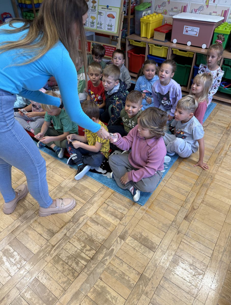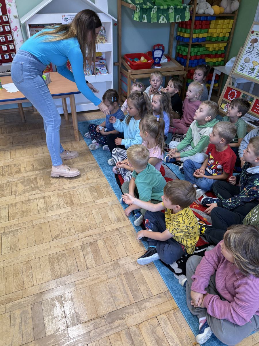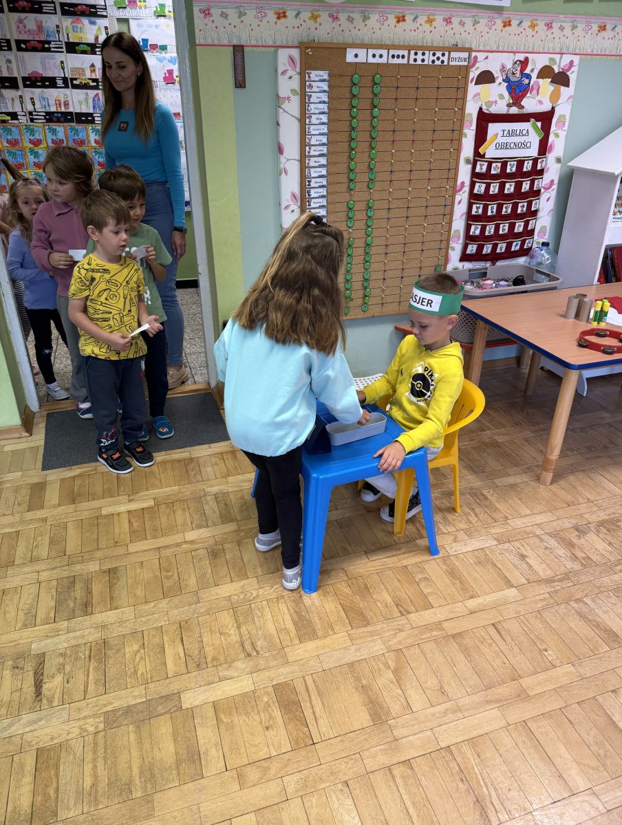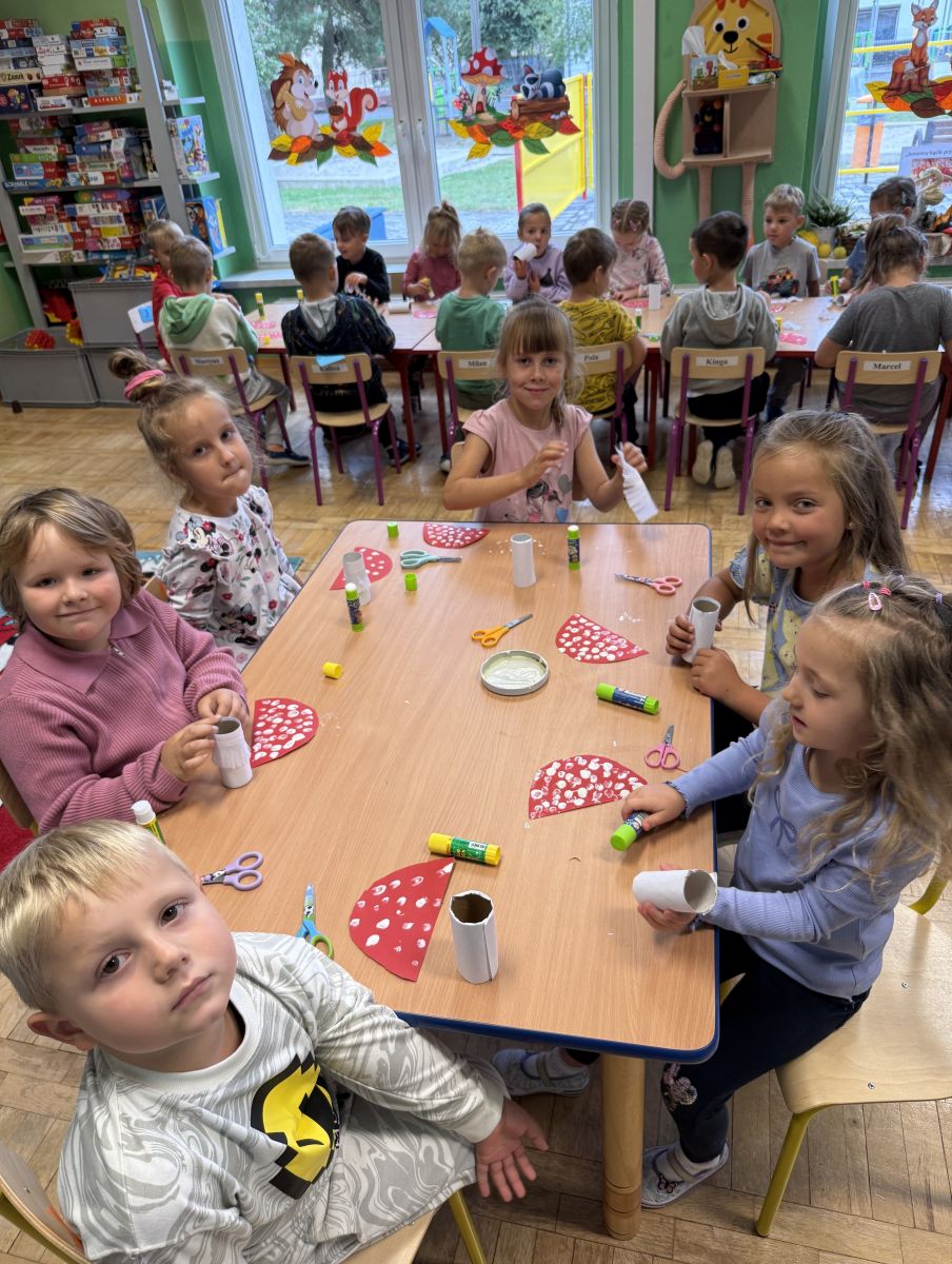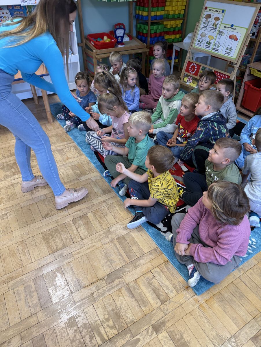 W grupie starszaków odbyło się wyjątkowe wydarzenie – teatrzyk kukiełkowy przygotowany przez panią Ewelinę i Dorotę. Już od samego początku dzieci mogły poczuć się jak prawdziwi widzowie teatru. Najpierw dowiedziały się, czym jest teatr i jak należy się w nim zachowywać. Następnie wybrano kasjera – w tej roli wystąpiło jedno z dzieci. Każdy przedszkolak otrzymał realistyczną kopię banknotu o nominale 10 zł, a następnie podchodził do kasy, by kupić bilet na przedstawienie. Podczas tej zabawy dzieci ćwiczyły także dobre maniery, używając magicznych słów: dzień dobry, poproszę, dziękuję. Bilety miały numery i kolory, które wskazywały miejsca na widowni. Kasjer sprawdzał, czy każdy usiadł na odpowiednim krzesełku. Po usłyszeniu dzwoneczka na scenie pojawił się grzybek, a chwilę później zwierzątka: jeżyk, myszka, ślimak, mrówki i żabka. Spektakl opowiadał o przyjaźni, współpracy i szacunku dla innych. Dzieci z ogromnym zainteresowaniem śledziły losy bohaterów i uważnie słuchały ich rozmów. Po występie chętnie przystąpiły do rozmowy na temat tego, czego nauczyła je bajka i jak ważne są dobre relacje w codziennym życiu. Po teatrzyku przedszkolaki uczestniczyły w dodatkowych zajęciach edukacyjnych. Przy tablicach demonstracyjnych poznały ciekawostki o grzybach – dowiedziały się, kiedy i w jaki sposób można je zbierać, jak należy się ubierać na wyprawę do lasu oraz dlaczego nigdy nie wolno chodzić tam samemu. Dzieci zapoznały się również z wybranymi gatunkami grzybów jadalnych i trujących. Na zakończenie nie zabrakło radosnej zabawy – przedszkolaki tańczyły do wesołej piosenki o muchomorku, a następnie wykonały pracę plastyczną – muchomorka z rolki po papierze toaletowym. Wielką atrakcją było także to, że po zajęciach mogły same pobawić się w teatr, odgrywając własne role.