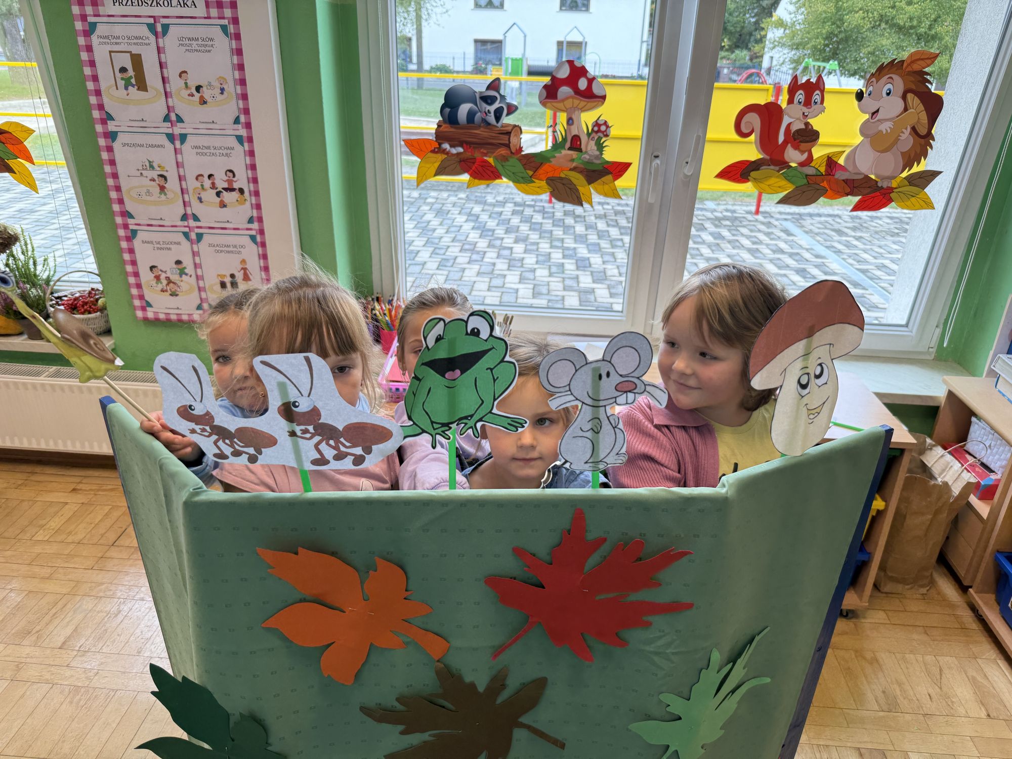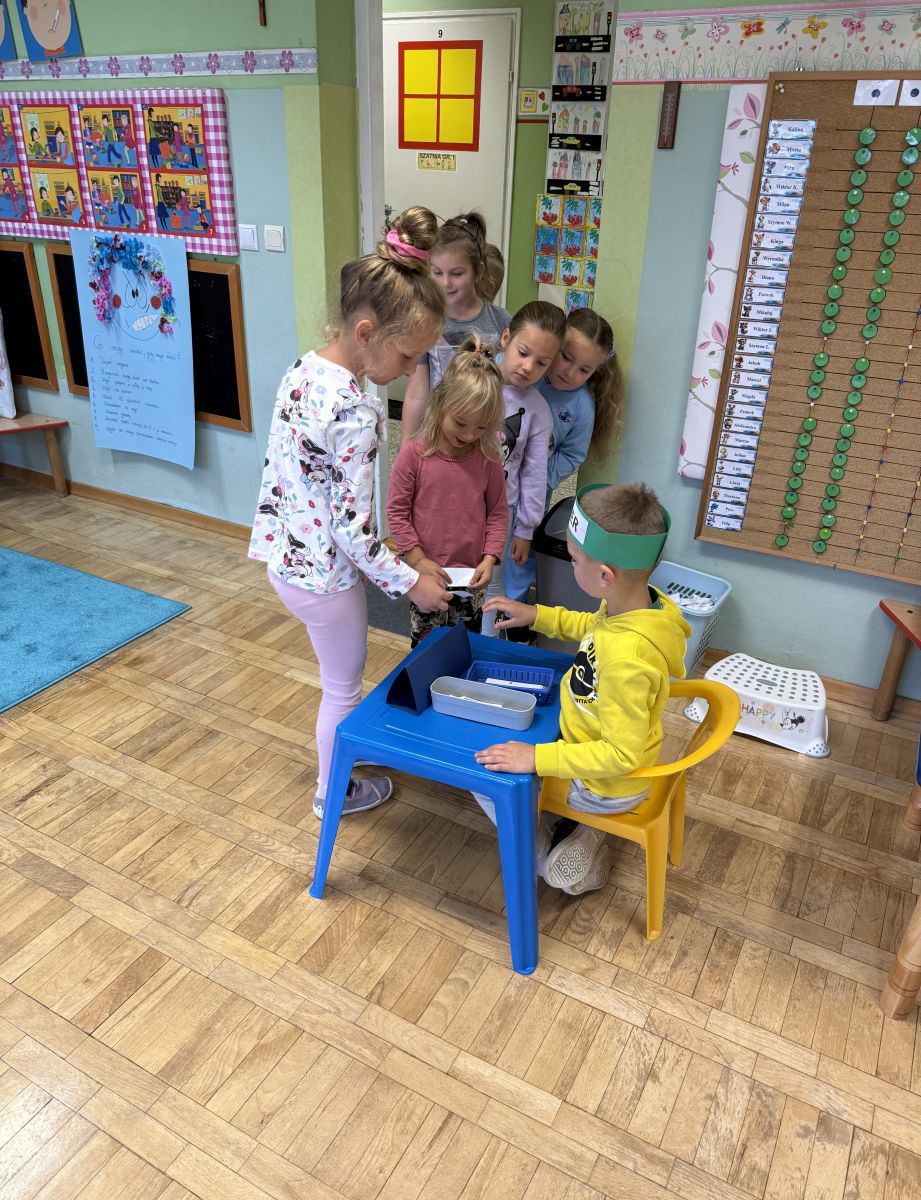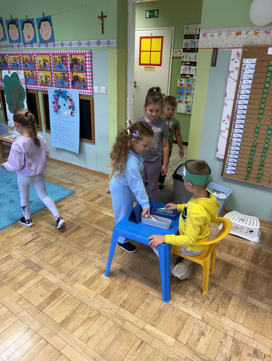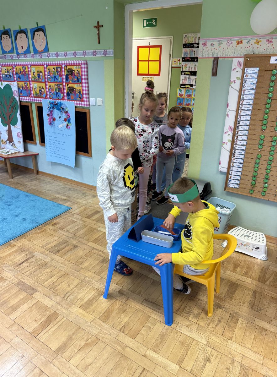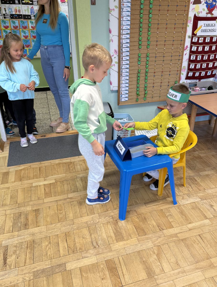 W grupie starszaków odbyło się wyjątkowe wydarzenie – teatrzyk kukiełkowy przygotowany przez panią Ewelinę i Dorotę. Już od samego początku dzieci mogły poczuć się jak prawdziwi widzowie teatru. Najpierw dowiedziały się, czym jest teatr i jak należy się w nim zachowywać. Następnie wybrano kasjera – w tej roli wystąpiło jedno z dzieci. Każdy przedszkolak otrzymał realistyczną kopię banknotu o nominale 10 zł, a następnie podchodził do kasy, by kupić bilet na przedstawienie. Podczas tej zabawy dzieci ćwiczyły także dobre maniery, używając magicznych słów: dzień dobry, poproszę, dziękuję. Bilety miały numery i kolory, które wskazywały miejsca na widowni. Kasjer sprawdzał, czy każdy usiadł na odpowiednim krzesełku. Po usłyszeniu dzwoneczka na scenie pojawił się grzybek, a chwilę później zwierzątka: jeżyk, myszka, ślimak, mrówki i żabka. Spektakl opowiadał o przyjaźni, współpracy i szacunku dla innych. Dzieci z ogromnym zainteresowaniem śledziły losy bohaterów i uważnie słuchały ich rozmów. Po występie chętnie przystąpiły do rozmowy na temat tego, czego nauczyła je bajka i jak ważne są dobre relacje w codziennym życiu. Po teatrzyku przedszkolaki uczestniczyły w dodatkowych zajęciach edukacyjnych. Przy tablicach demonstracyjnych poznały ciekawostki o grzybach – dowiedziały się, kiedy i w jaki sposób można je zbierać, jak należy się ubierać na wyprawę do lasu oraz dlaczego nigdy nie wolno chodzić tam samemu. Dzieci zapoznały się również z wybranymi gatunkami grzybów jadalnych i trujących. Na zakończenie nie zabrakło radosnej zabawy – przedszkolaki tańczyły do wesołej piosenki o muchomorku, a następnie wykonały pracę plastyczną – muchomorka z rolki po papierze toaletowym. Wielką atrakcją było także to, że po zajęciach mogły same pobawić się w teatr, odgrywając własne role.