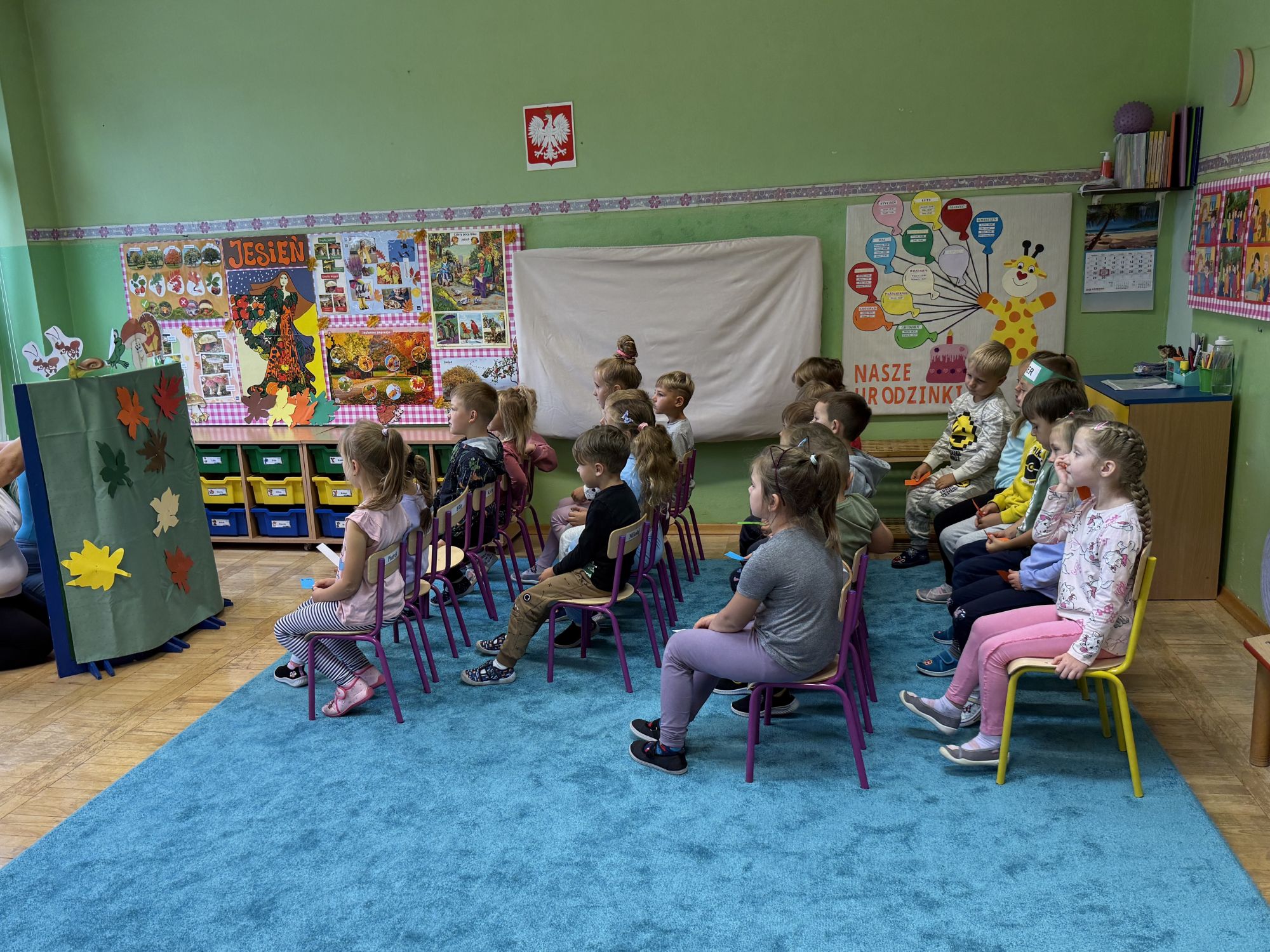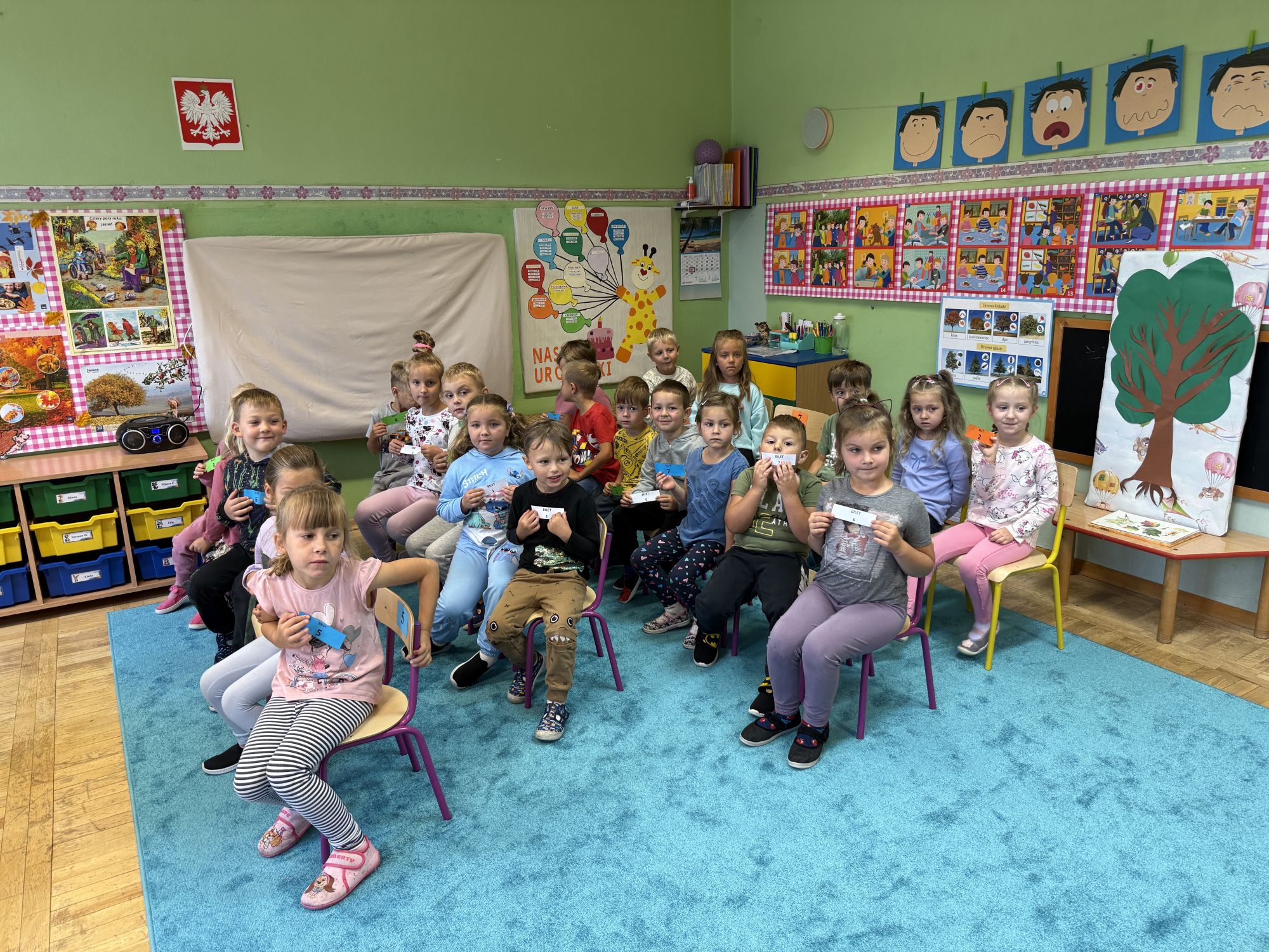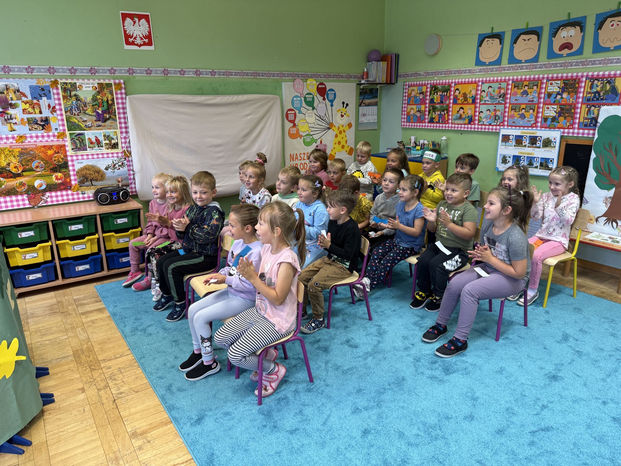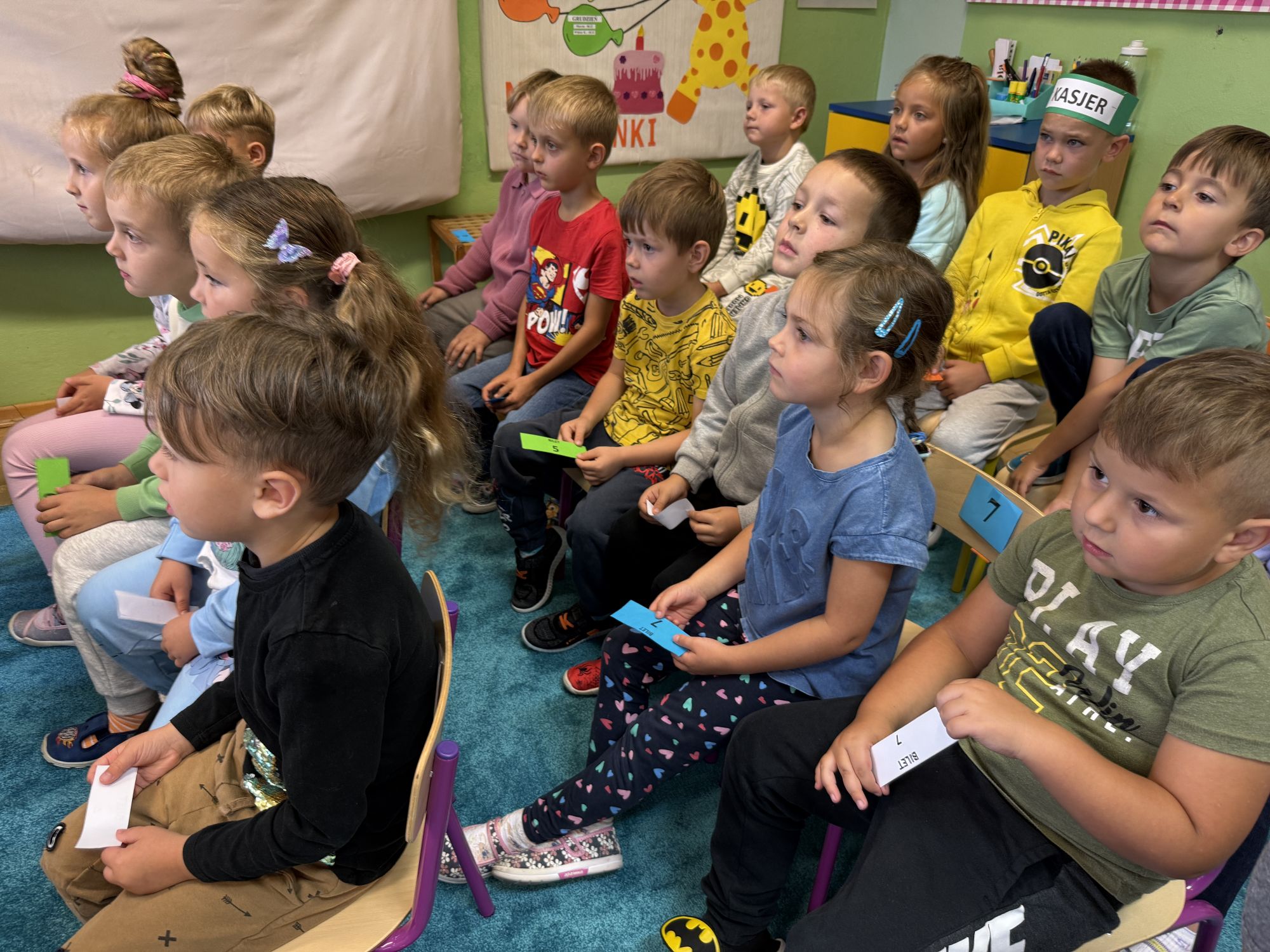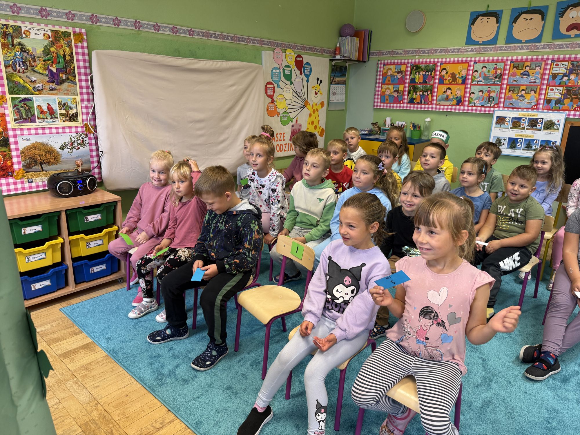 W grupie starszaków odbyło się wyjątkowe wydarzenie – teatrzyk kukiełkowy przygotowany przez panią Ewelinę i Dorotę. Już od samego początku dzieci mogły poczuć się jak prawdziwi widzowie teatru. Najpierw dowiedziały się, czym jest teatr i jak należy się w nim zachowywać. Następnie wybrano kasjera – w tej roli wystąpiło jedno z dzieci. Każdy przedszkolak otrzymał realistyczną kopię banknotu o nominale 10 zł, a następnie podchodził do kasy, by kupić bilet na przedstawienie. Podczas tej zabawy dzieci ćwiczyły także dobre maniery, używając magicznych słów: dzień dobry, poproszę, dziękuję. Bilety miały numery i kolory, które wskazywały miejsca na widowni. Kasjer sprawdzał, czy każdy usiadł na odpowiednim krzesełku. Po usłyszeniu dzwoneczka na scenie pojawił się grzybek, a chwilę później zwierzątka: jeżyk, myszka, ślimak, mrówki i żabka. Spektakl opowiadał o przyjaźni, współpracy i szacunku dla innych. Dzieci z ogromnym zainteresowaniem śledziły losy bohaterów i uważnie słuchały ich rozmów. Po występie chętnie przystąpiły do rozmowy na temat tego, czego nauczyła je bajka i jak ważne są dobre relacje w codziennym życiu. Po teatrzyku przedszkolaki uczestniczyły w dodatkowych zajęciach edukacyjnych. Przy tablicach demonstracyjnych poznały ciekawostki o grzybach – dowiedziały się, kiedy i w jaki sposób można je zbierać, jak należy się ubierać na wyprawę do lasu oraz dlaczego nigdy nie wolno chodzić tam samemu. Dzieci zapoznały się również z wybranymi gatunkami grzybów jadalnych i trujących. Na zakończenie nie zabrakło radosnej zabawy – przedszkolaki tańczyły do wesołej piosenki o muchomorku, a następnie wykonały pracę plastyczną – muchomorka z rolki po papierze toaletowym. Wielką atrakcją było także to, że po zajęciach mogły same pobawić się w teatr, odgrywając własne role.