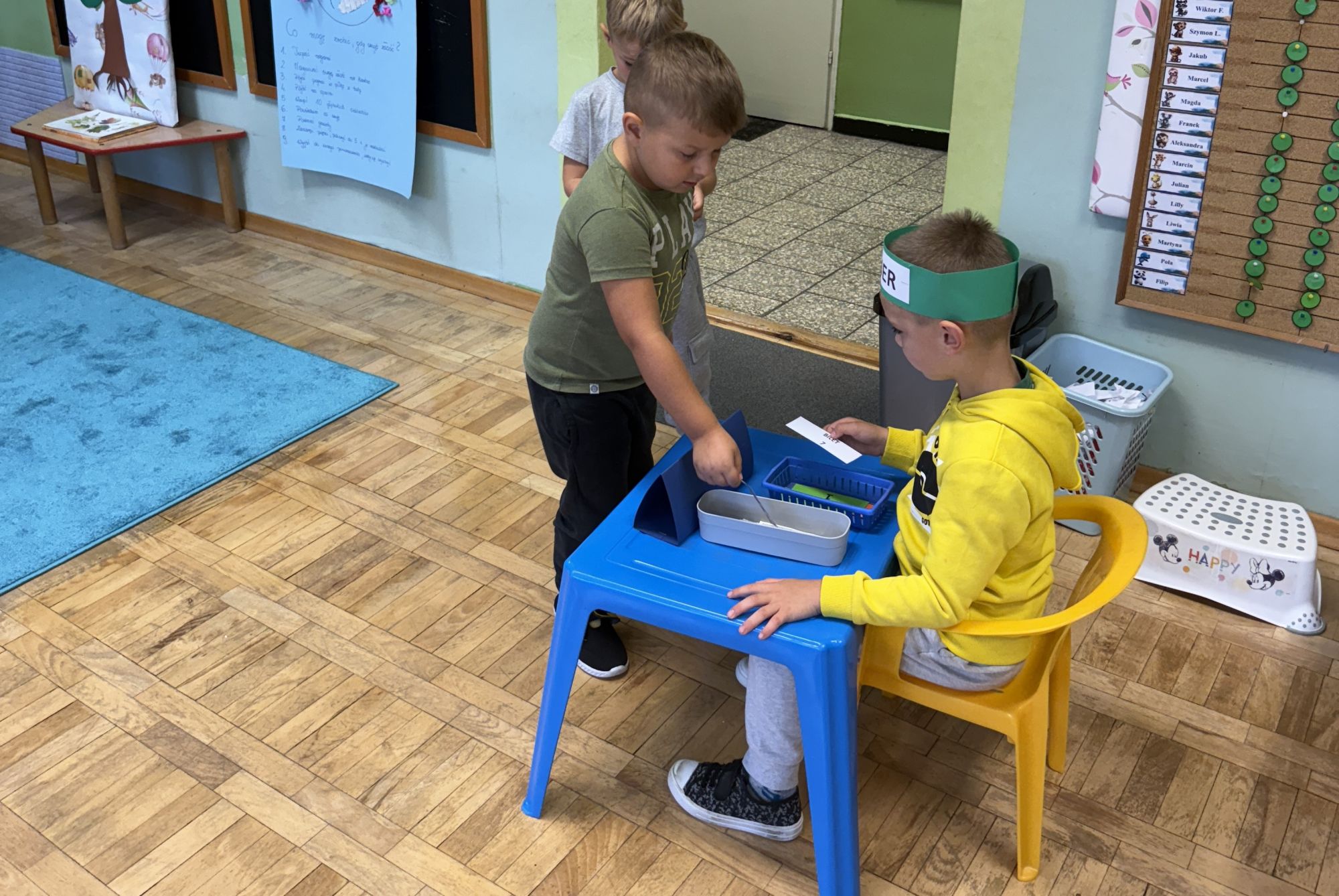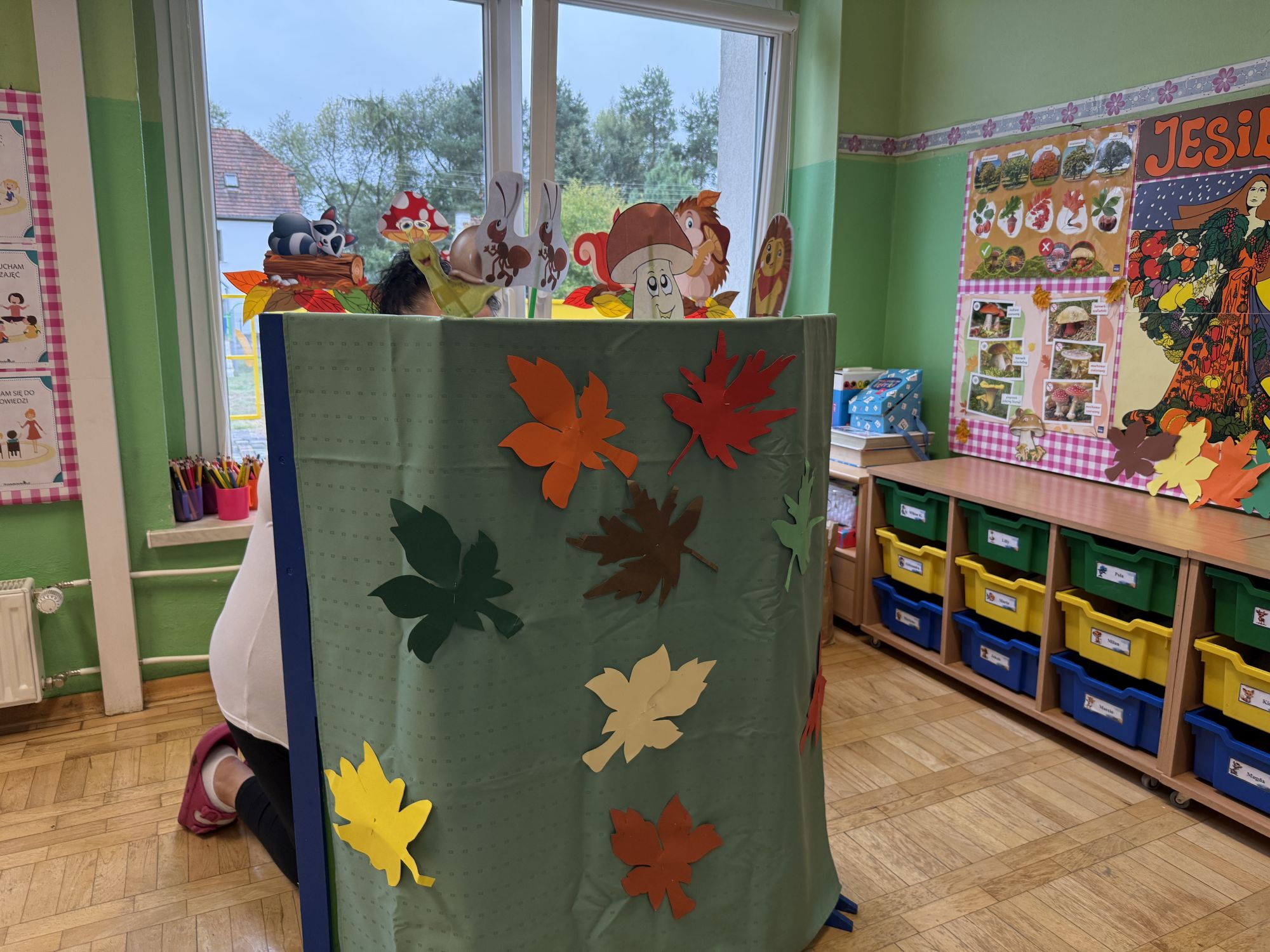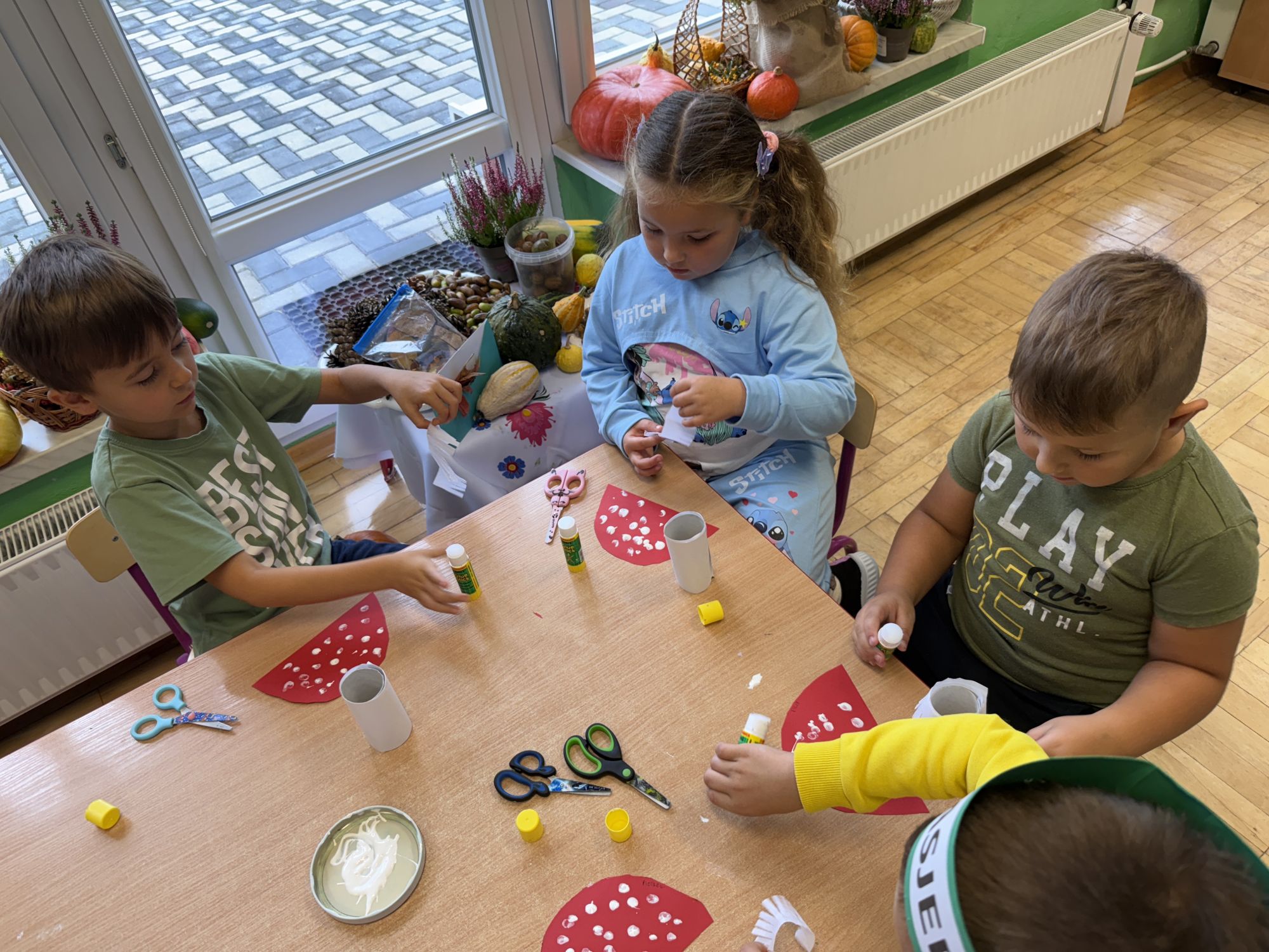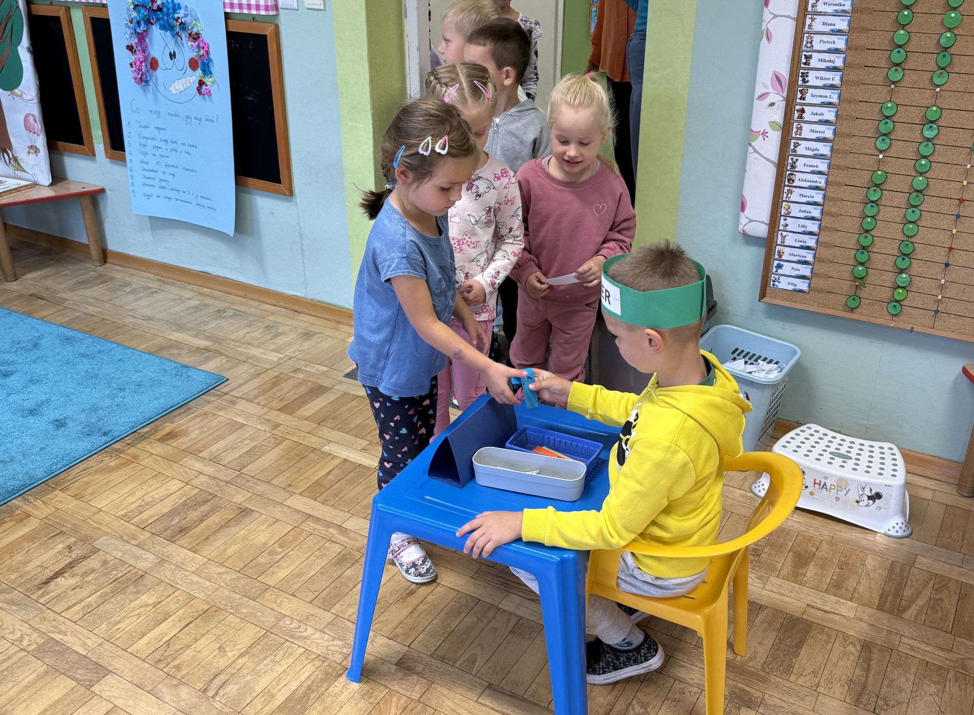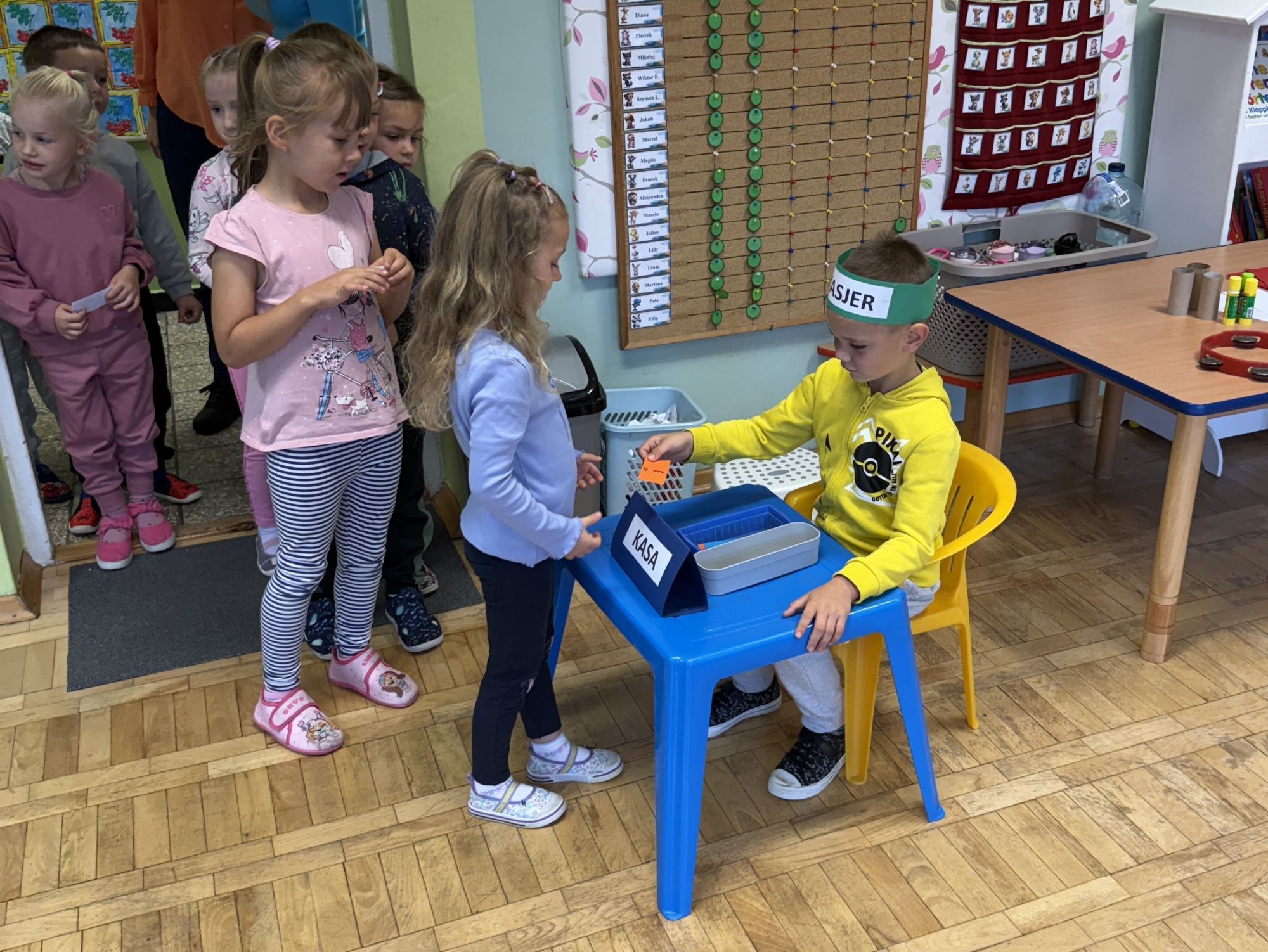 W grupie starszaków odbyło się wyjątkowe wydarzenie – teatrzyk kukiełkowy przygotowany przez panią Ewelinę i Dorotę. Już od samego początku dzieci mogły poczuć się jak prawdziwi widzowie teatru. Najpierw dowiedziały się, czym jest teatr i jak należy się w nim zachowywać. Następnie wybrano kasjera – w tej roli wystąpiło jedno z dzieci. Każdy przedszkolak otrzymał realistyczną kopię banknotu o nominale 10 zł, a następnie podchodził do kasy, by kupić bilet na przedstawienie. Podczas tej zabawy dzieci ćwiczyły także dobre maniery, używając magicznych słów: dzień dobry, poproszę, dziękuję. Bilety miały numery i kolory, które wskazywały miejsca na widowni. Kasjer sprawdzał, czy każdy usiadł na odpowiednim krzesełku. Po usłyszeniu dzwoneczka na scenie pojawił się grzybek, a chwilę później zwierzątka: jeżyk, myszka, ślimak, mrówki i żabka. Spektakl opowiadał o przyjaźni, współpracy i szacunku dla innych. Dzieci z ogromnym zainteresowaniem śledziły losy bohaterów i uważnie słuchały ich rozmów. Po występie chętnie przystąpiły do rozmowy na temat tego, czego nauczyła je bajka i jak ważne są dobre relacje w codziennym życiu. Po teatrzyku przedszkolaki uczestniczyły w dodatkowych zajęciach edukacyjnych. Przy tablicach demonstracyjnych poznały ciekawostki o grzybach – dowiedziały się, kiedy i w jaki sposób można je zbierać, jak należy się ubierać na wyprawę do lasu oraz dlaczego nigdy nie wolno chodzić tam samemu. Dzieci zapoznały się również z wybranymi gatunkami grzybów jadalnych i trujących. Na zakończenie nie zabrakło radosnej zabawy – przedszkolaki tańczyły do wesołej piosenki o muchomorku, a następnie wykonały pracę plastyczną – muchomorka z rolki po papierze toaletowym. Wielką atrakcją było także to, że po zajęciach mogły same pobawić się w teatr, odgrywając własne role.