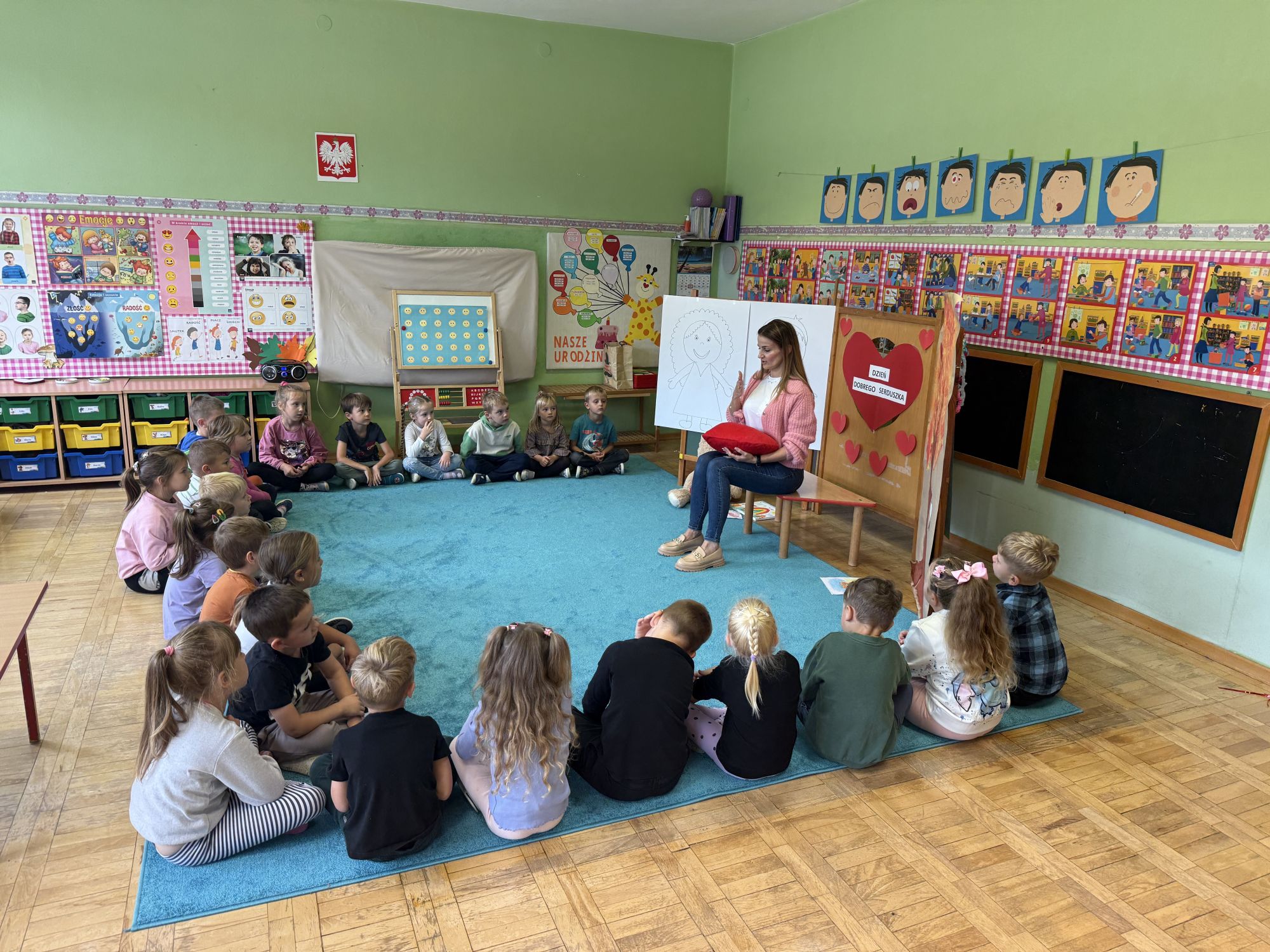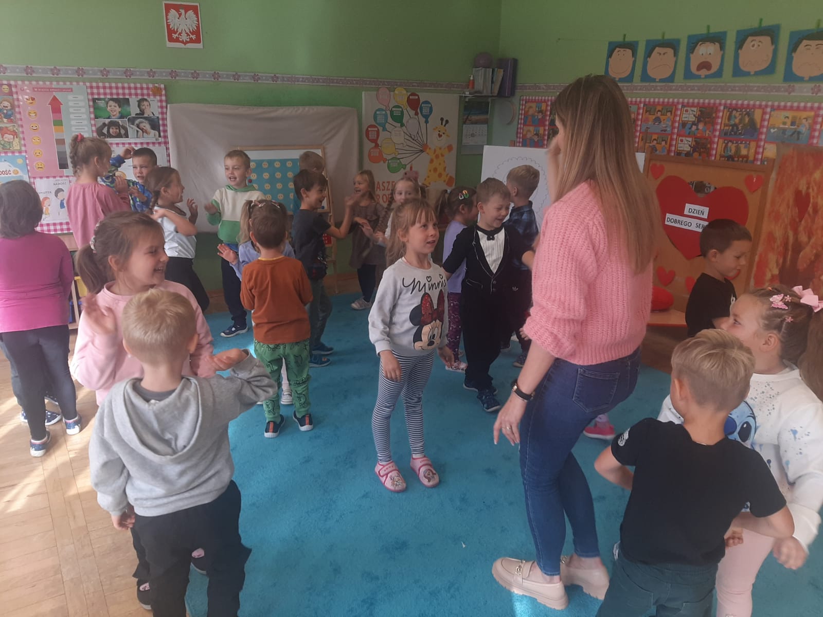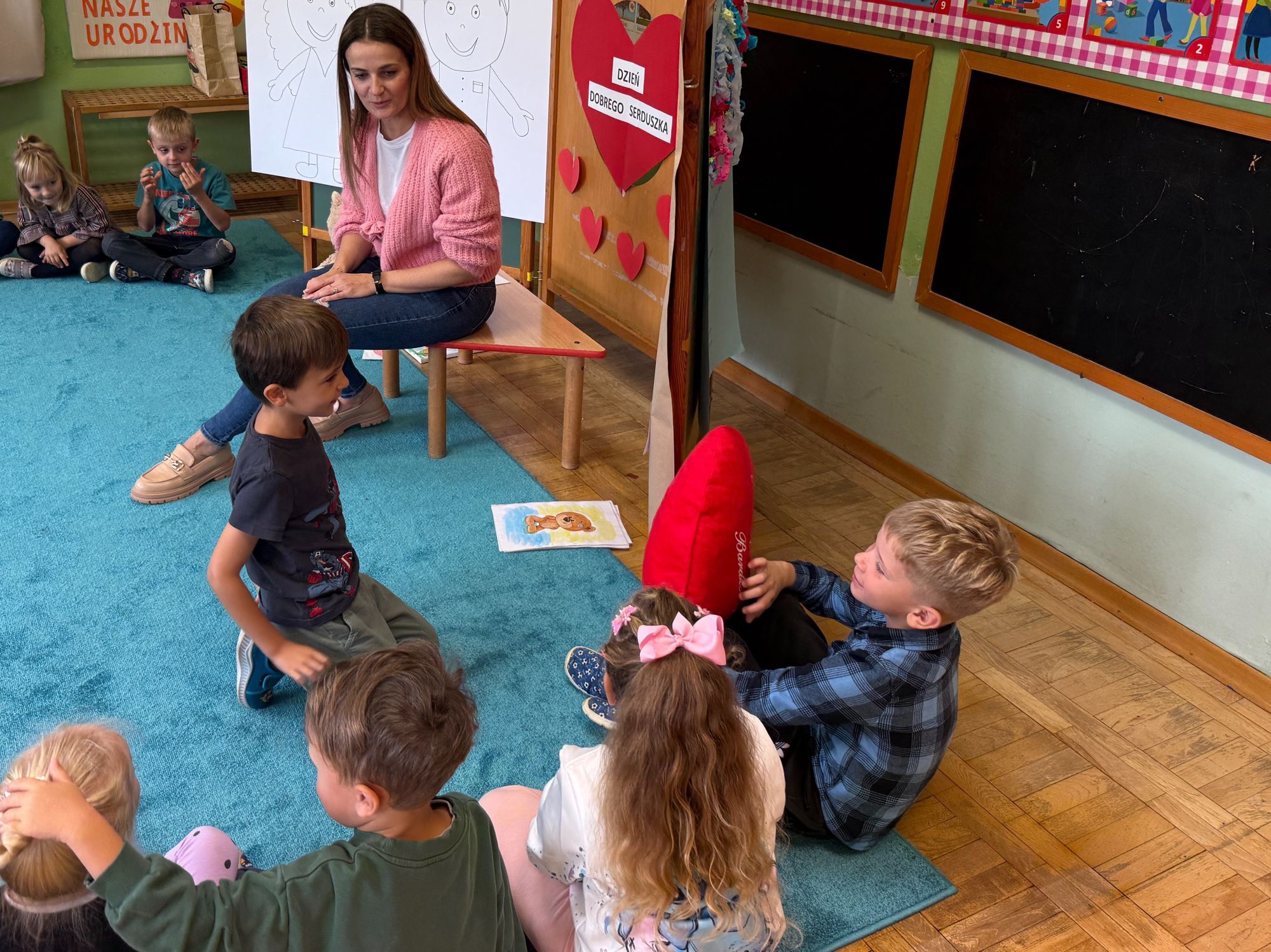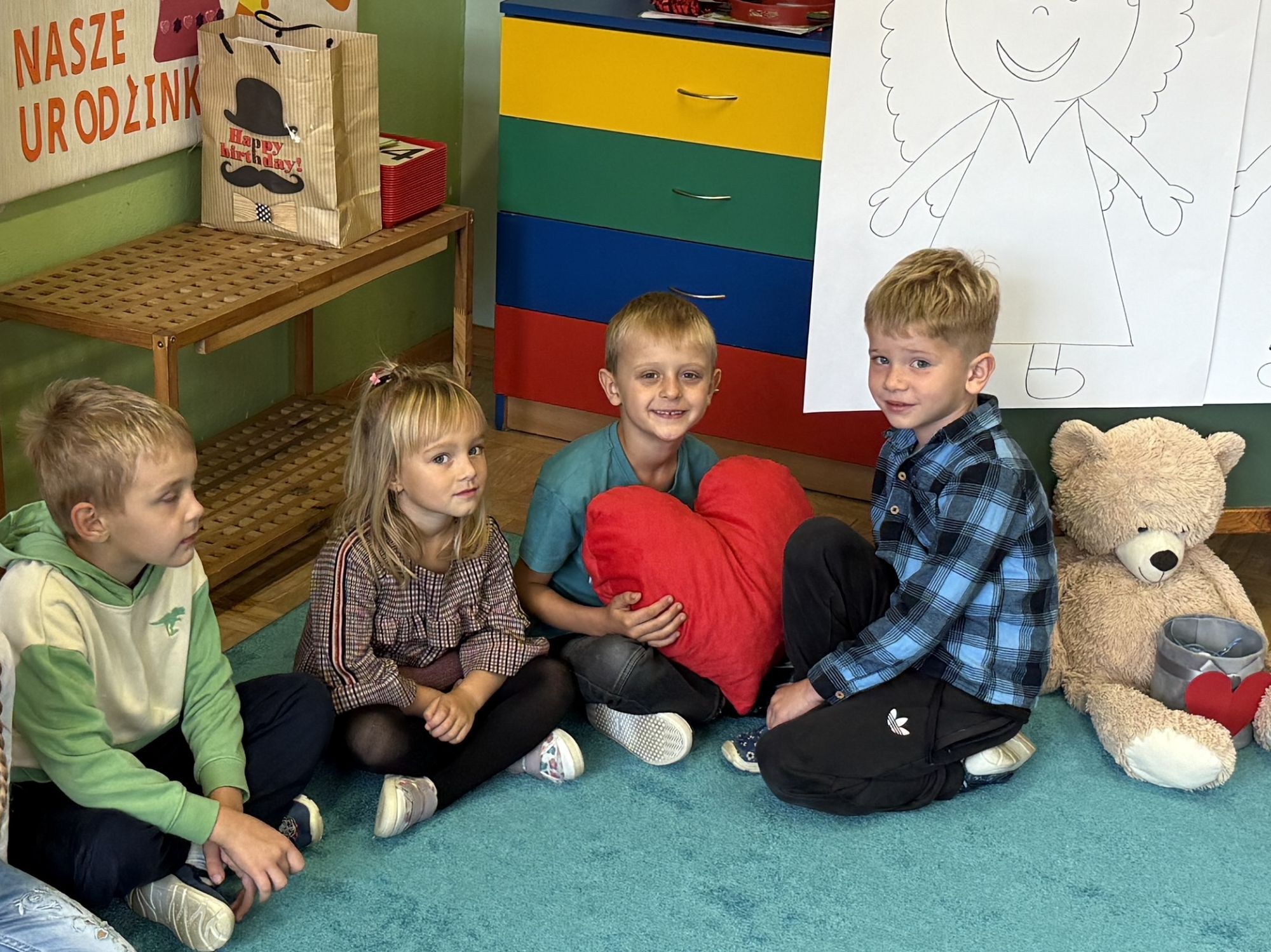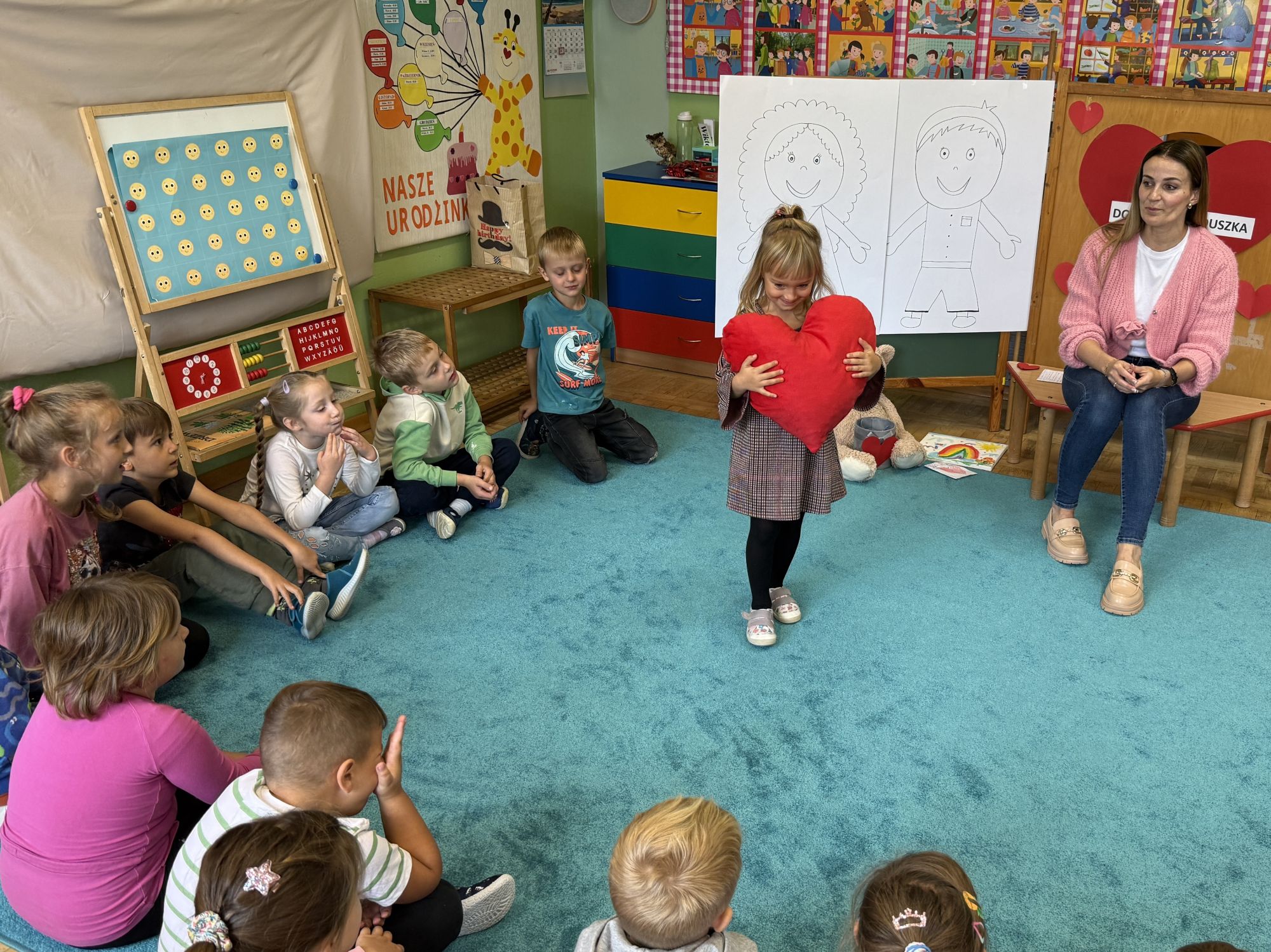 29 września w starszej grupie naszego przedszkola odbył się wyjątkowy dzień – „Dzień Dobrego Serduszka”, zorganizowany w ramach Tygodnia Dobrych Relacji. Była to okazja do rozmów, zabawy i wspólnej refleksji nad tym, co to znaczy mieć dobre serce i jak budować wartościowe przyjaźnie. Dzieci rozpoczęły zajęcia od burzy mózgów, podczas której wspólnie zastanawiały się, co oznacza bycie osobą o dobrym sercu. Następnie wysłuchały pięknej bajki pt. „Serduszko małego misia”. Opowieść stała się punktem wyjścia do rozmowy o miłości, przyjaźni i odwadze – wartościach szczególnie ważnych w codziennym życiu przedszkolaka. Aby lepiej zrozumieć treść bajki, dzieci ułożyły gałązkę logiczną, porządkując kolejno wydarzenia i ukazując ich sens. Nie zabrakło również aktywności rozwijających relacje rówieśnicze. Podczas zabawy „Wędrujące serduszko” dzieci mówiły sobie nawzajem coś miłego, ucząc się dostrzegać i doceniać innych. Odgrywały różne scenki dramowe, w których wyrażały emocje za pomocą ruchu i mimiki. Radosnym akcentem był udział w tańcach w parach oraz zabawach integrujących grupę. Szczególną atrakcją była praca plastyczna – dzieci w grupach kolorowały duże obrazki przedstawiające dziewczynkę i chłopca, a następnie rozmawiały o tym, jaki powinien być dobry kolega i dobra koleżanka. Dzięki temu mogły nie tylko rozwijać swoją kreatywność, ale także uświadomić sobie, jak ważne są pozytywne cechy w budowaniu przyjaźni. Powstało również niezwykłe Drzewo Przyjaźni – każde dziecko narysowało na serduszku siebie i swojego przyjaciela z grupy, a następnie zawiesiło je na wspólnym drzewie. Na zakończenie pełnego wrażeń dnia dzieci otrzymały wyjątkowe medale z napisem „Jestem dobrym kolegą/koleżanką”. Była to piękna nagroda za zaangażowanie, życzliwość i otwarte serca.