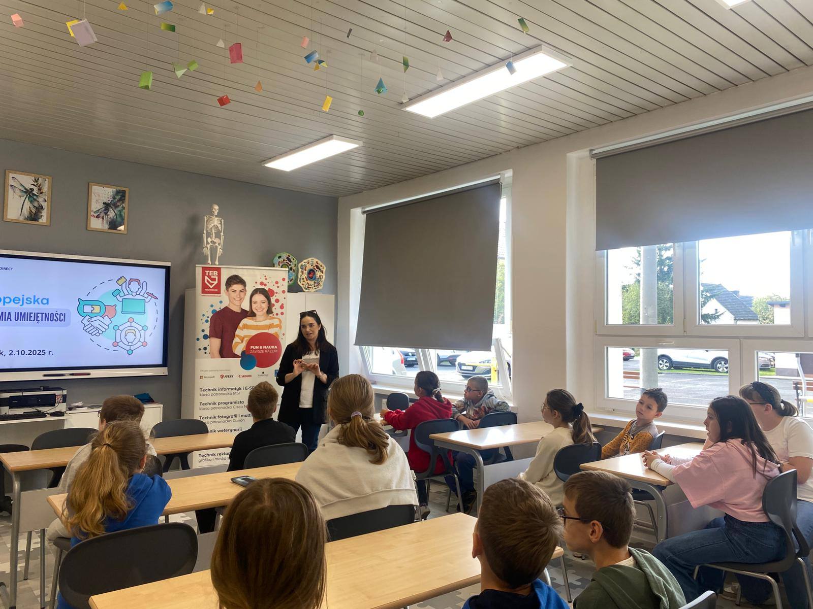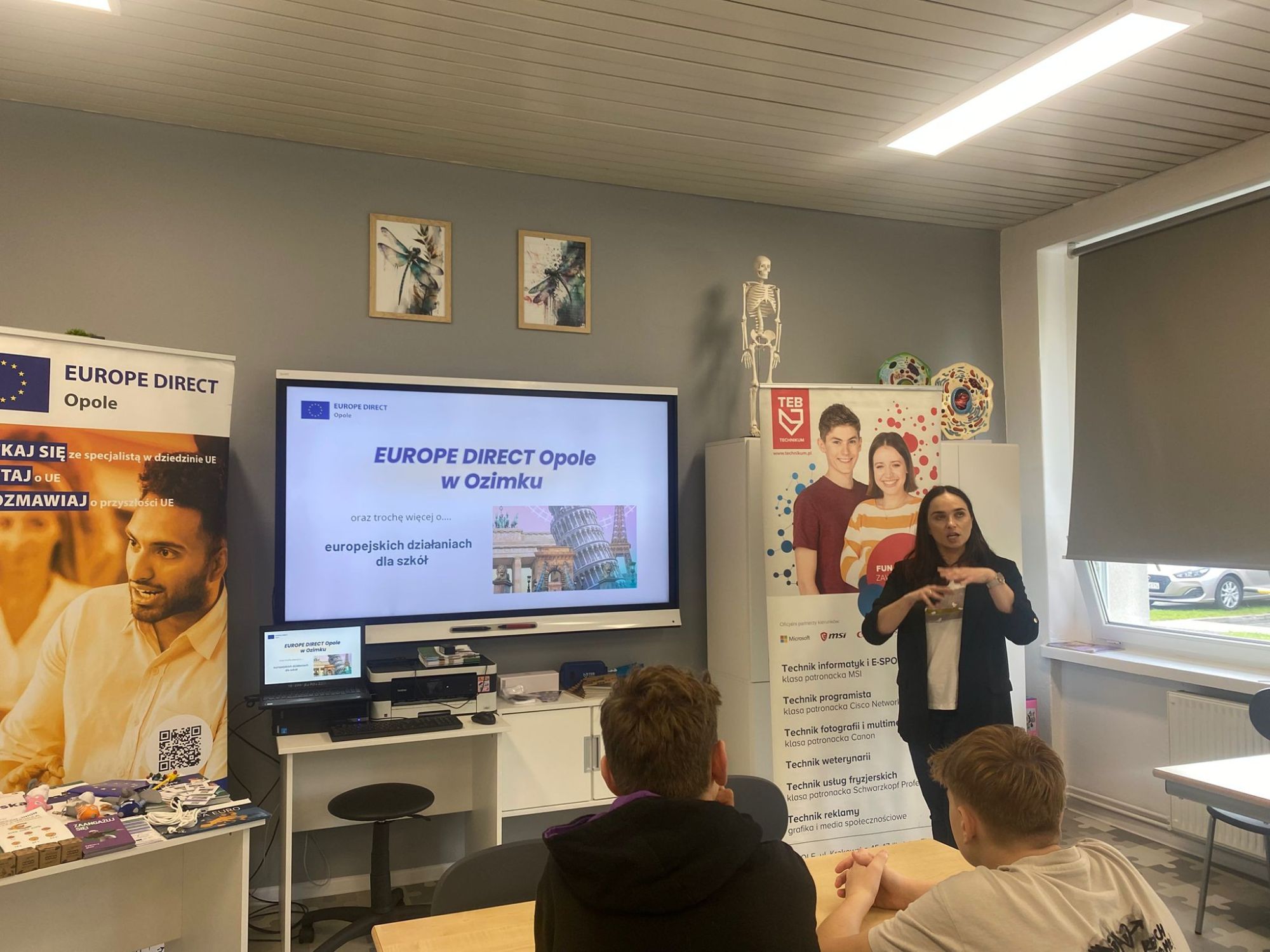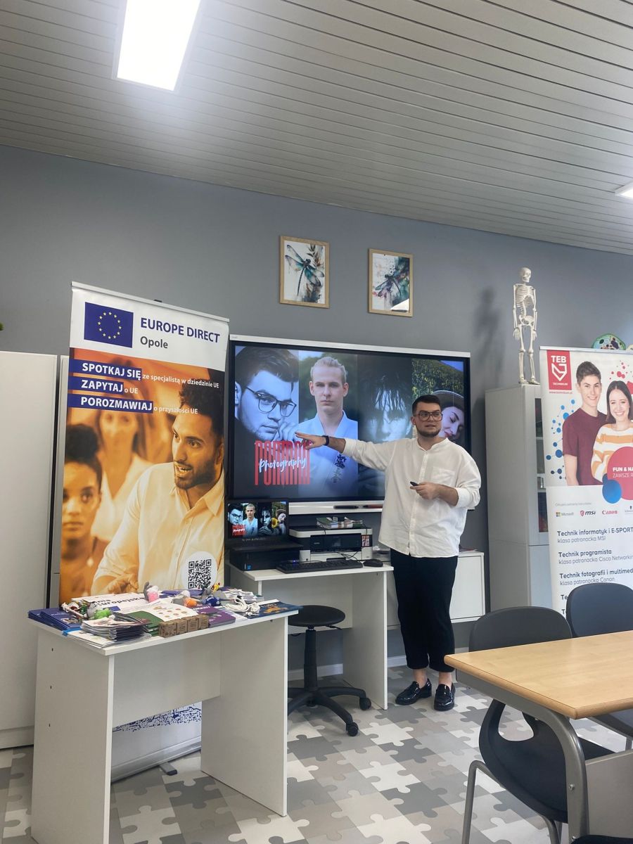W naszej szkole odbyło się wyjątkowe spotkanie z przedstawicielką Europe Direct Opole, która opowiedziała uczniom o różnych projektach i inicjatywach Unii Europejskiej skierowanych do szkół. Młodzież miała okazję dowiedzieć się więcej o możliwościach, jakie daje uczestnictwo w programach europejskich, a także o korzyściach płynących ze współpracy międzynarodowej. Dodatkowo, pan Oliwer ze szkoły TEB Liceum i Technikum w Opolu przeprowadził inspirujące warsztaty fotograficzne. Uczniowie mogli poznać podstawy fotografii, dowiedzieć się, jak tworzyć ciekawe kadry i wykorzystywać światło w praktyce. Dziękujemy za inspirującą wizytę i ciekawe zajęcia!