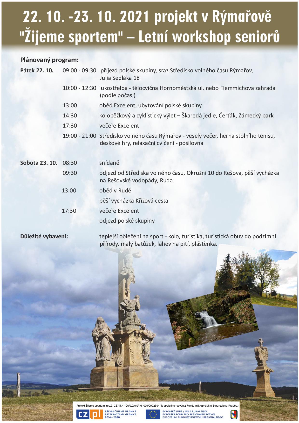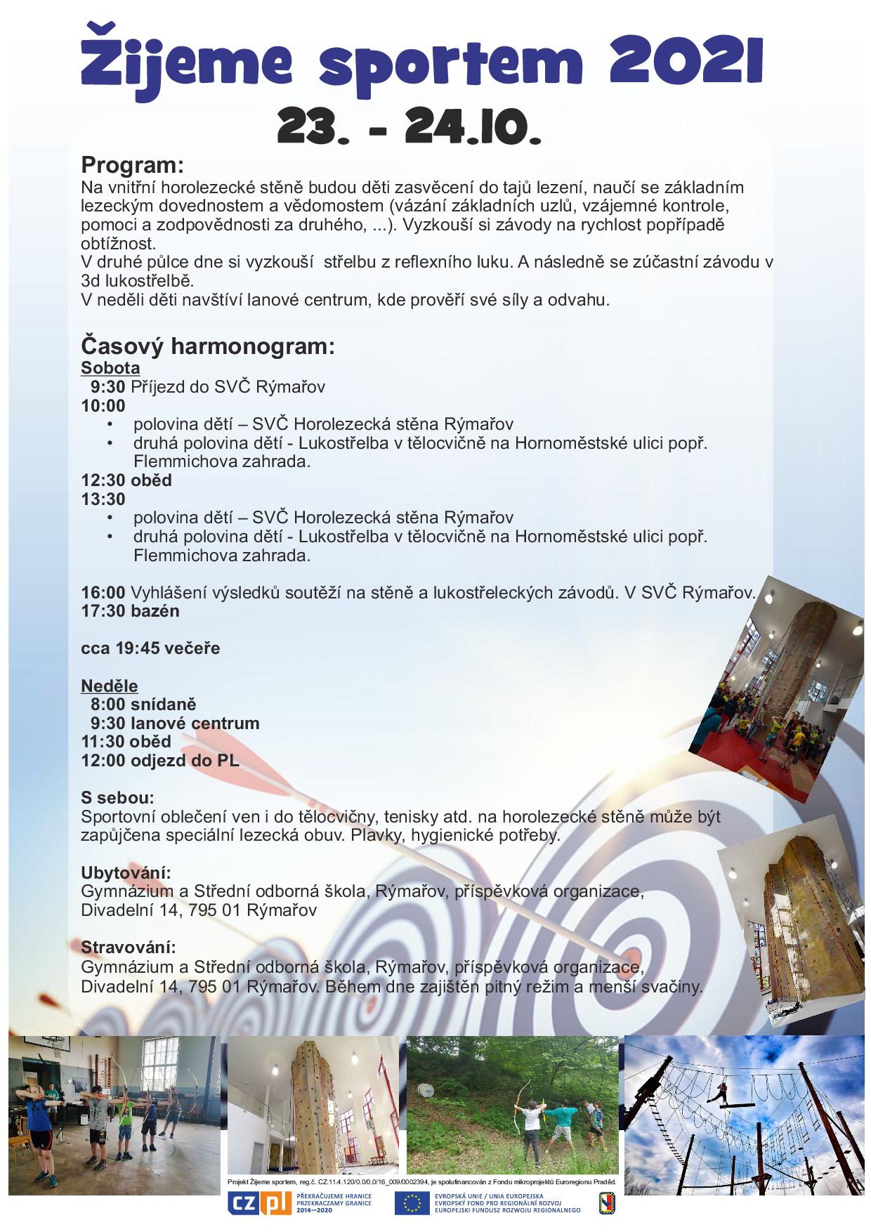 „Żyjemy sportem” projekt jest współfinansowany ze środków Europejskiego Funduszu Rozwoju Regionalnego w ramach programu INTERREG V-A Republika Czeska-Polska oraz ze środków budżetu państwa. Przekraczamy granice w ramach Funduszu Mikroprojektów Euroregionu Pradziad.