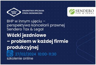 Wałbrzyska Specjalna Strefa Ekonomiczna "INVEST-PARK" wspólnie z Kancelarią Sendero Tax & Legal zaprasza na webinarium Wózki jezdniowe – problem w każdej firmie produkcyjnej, które odbędzie się 27 lutego 2024 r. w godzinach 10:00 - 11:30.