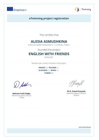 Z dumą informujemy, iż międzynarodowy projekt językowy pod tytułem "Welcome to my dreamland" oraz nauczycielka języka angielskiego ALESIA ASMUSHKINA otrzymali Europejską Odznakę Jakości eTwinning. Jest to już drugie wyróżnienie na dużą skalę dla tego projektu, gdyż w cz ... [ więcej ]