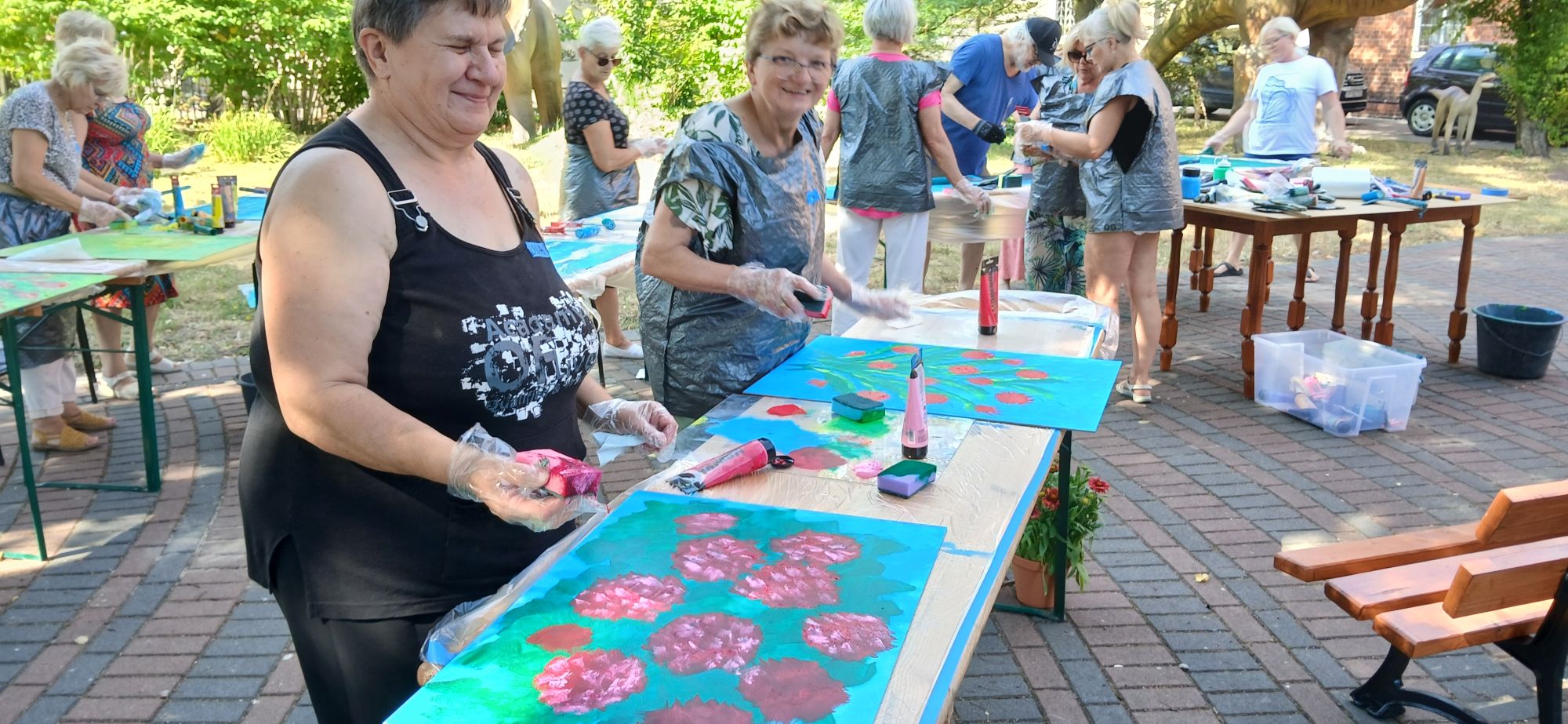 Podzieliłyśmy się na dwie grupy, jedne panie malowały barwne kwiaty nawiązując do pięknej pogody i barw lata, a inne, kierując się sugestią Pana Romana malowały elementy marynistyczne marząc o wypoczynku nad morzem. Na obrazach mieszały się odcienie zieleni, turkusu rozświetlone białą barwą falującego morza czy chmur na niebie, a czasami żaglówki kołyszącej się na wodzie.