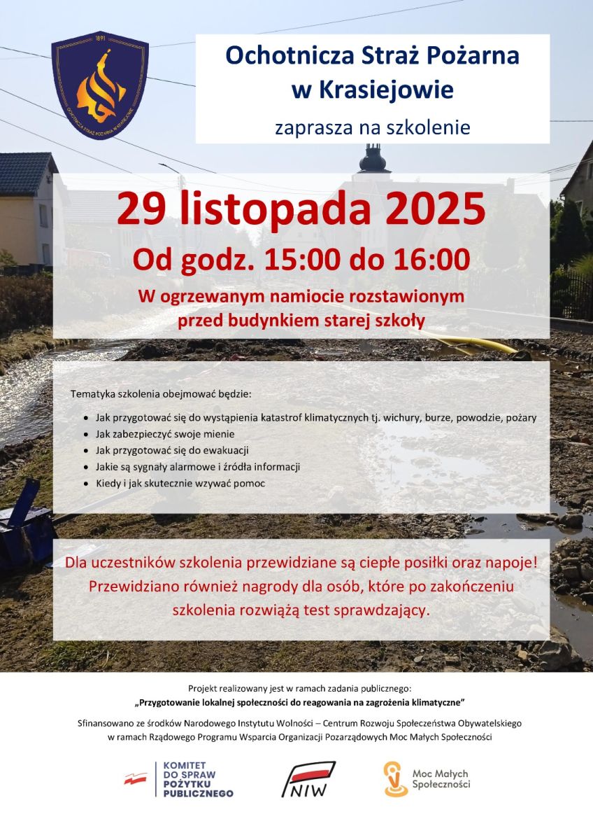 W sobotę, 29 listopadę, w godz. 15:00–16:00 w pawilonie przy starej szkole w Krasiejowie, odbędzie się Szkolenie „Jak reagować na zagrożenia klimatyczne”.