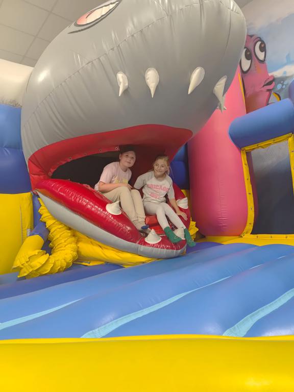 Zanim dzieci wyruszyły do Hoplandii, wzięły udział w zajęciach terapeutyczno-refleksyjnych inspirowanych filmem „Elio”. Rozmawiały o emocjach głównego bohatera, odwadze w byciu sobą i budowaniu relacji. Poprzez zabawy i pracę w grupach dzieci uczyły się, jak mówić o uczuciach i jak ważna jest akceptacja... i przede wszystkim rodzina. Po tej wartościowej części dnia przyszedł czas na szaleństwo w Hoplandii – największej sali zabaw w regionie! Dzieci skakały na trampolinach, wspinały się, zjeżdżały, pokonywały przeszkody i... zużyły mnóstwo energii.