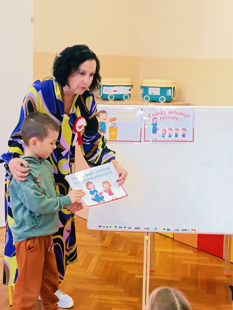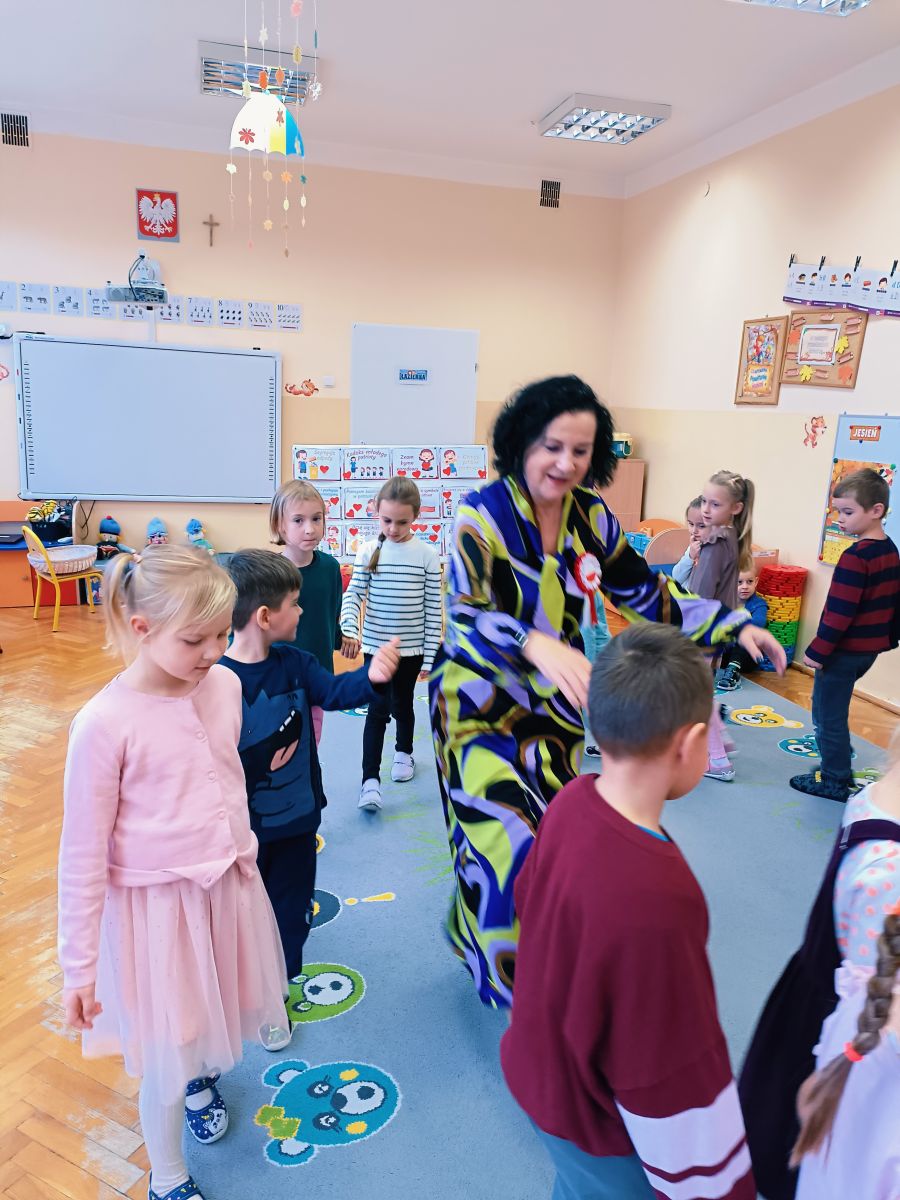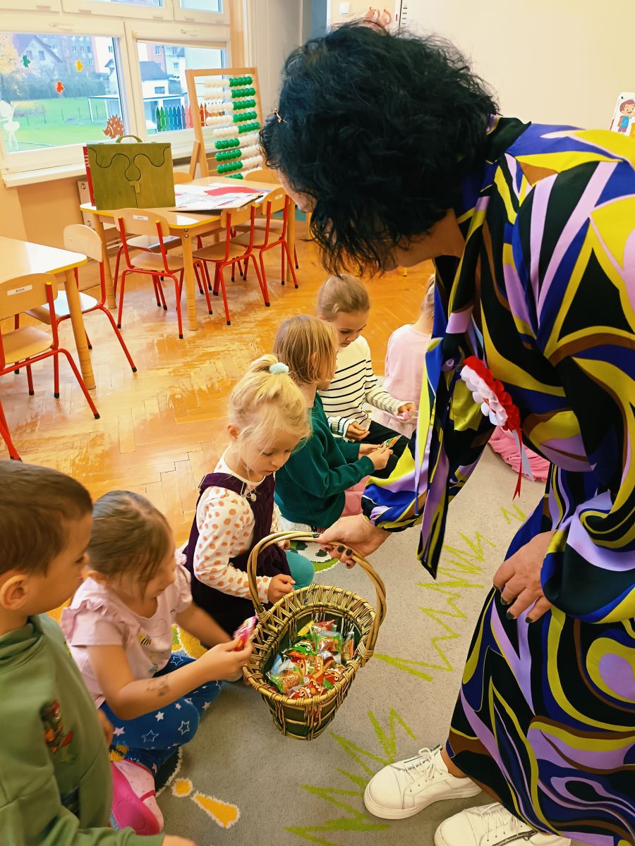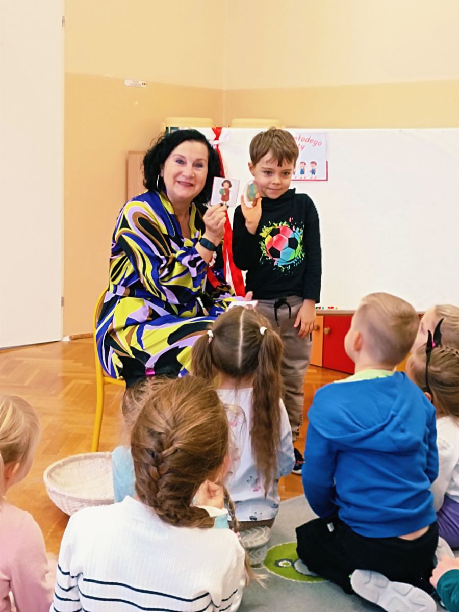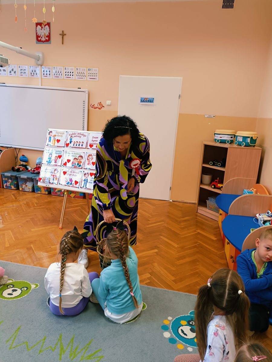3 listopada 2025r.odwiedziła Przedszkole Publiczne Nr 1 w Ozimku , grupę Tygrysków pani Grażyna Świercz-bibliotekarka z Publicznej Szkoły Podstawowej Nr 1 w Ozimku.Za pomocą teatrzyku kamishibai przedstawiła dzieciom Legendę o powstaniu państwa polskiego –„O Lechu, Czechu i Rusie” Następnie zaprosiła przedszkolaki do quizu na temat państwa polskiego, tworzenia „Kodeksu małego patrioty” oraz odtańczenia fantazyjnego mazurka. Po zajęciach dzieci zostały nagrodzone słodkim upominkiem. Przedszkolaki wręczyły laurkę pani Grażynce w ramach podziękowań za kreatywne i bardzo pouczające zajęcia.