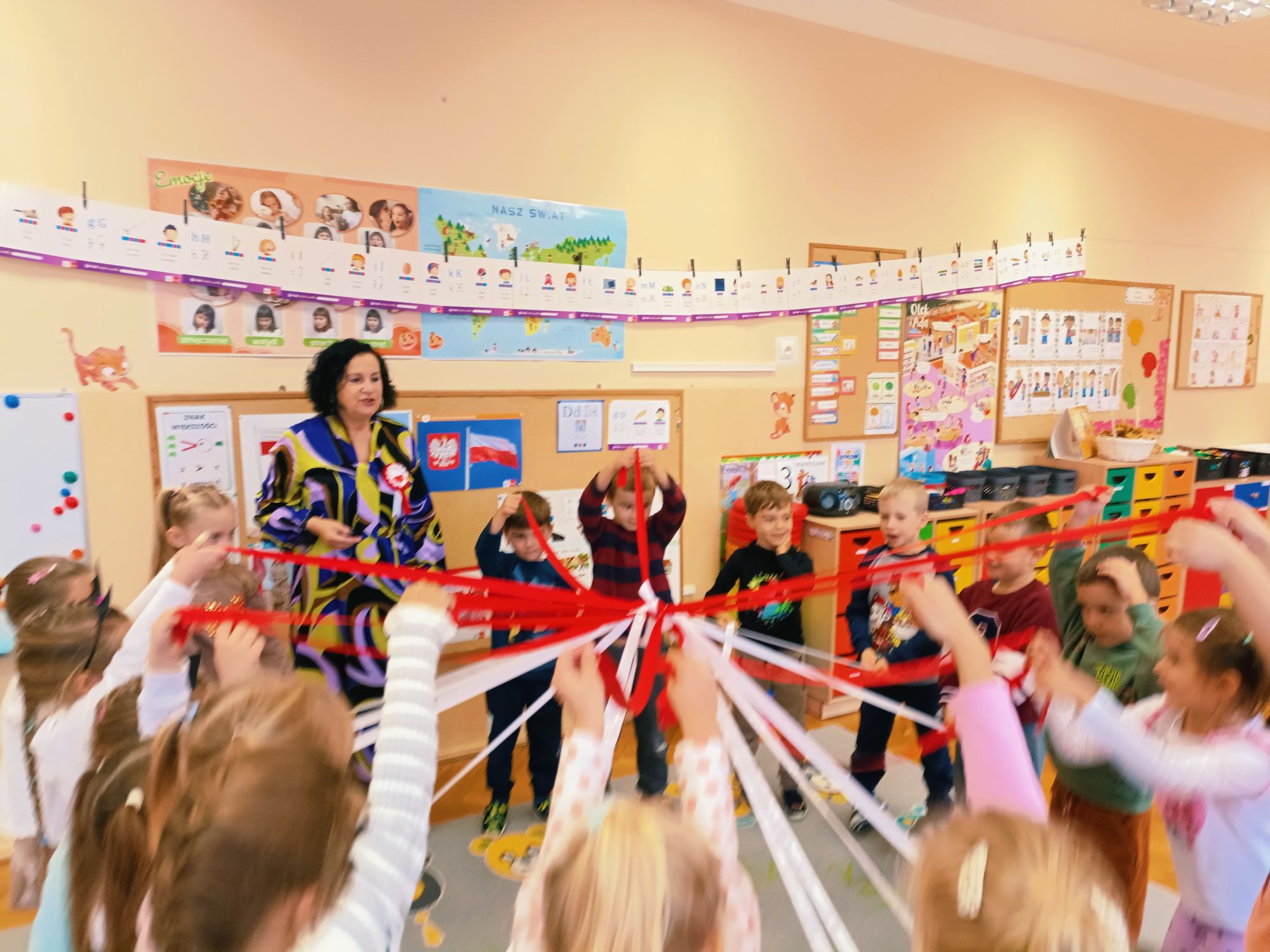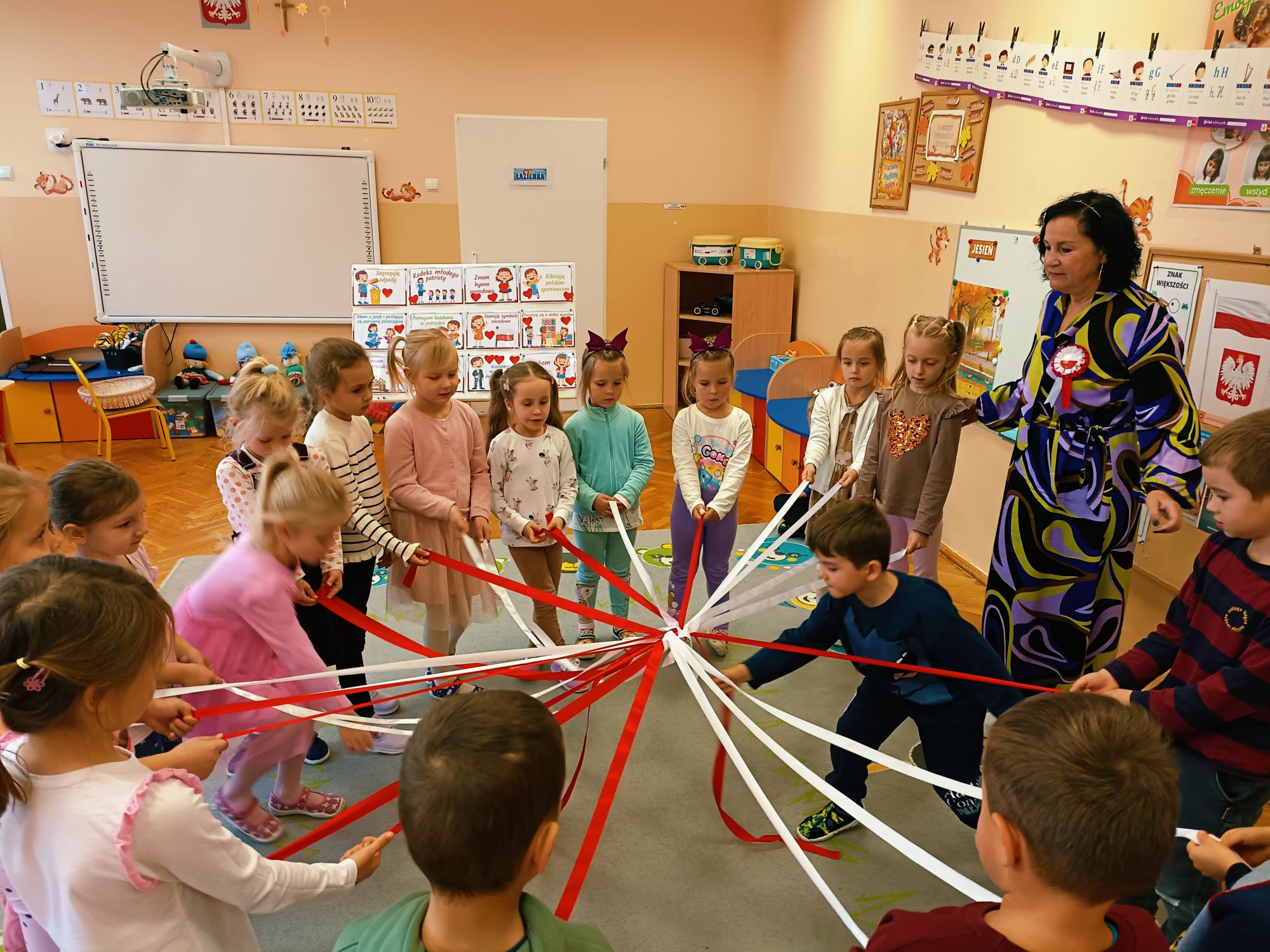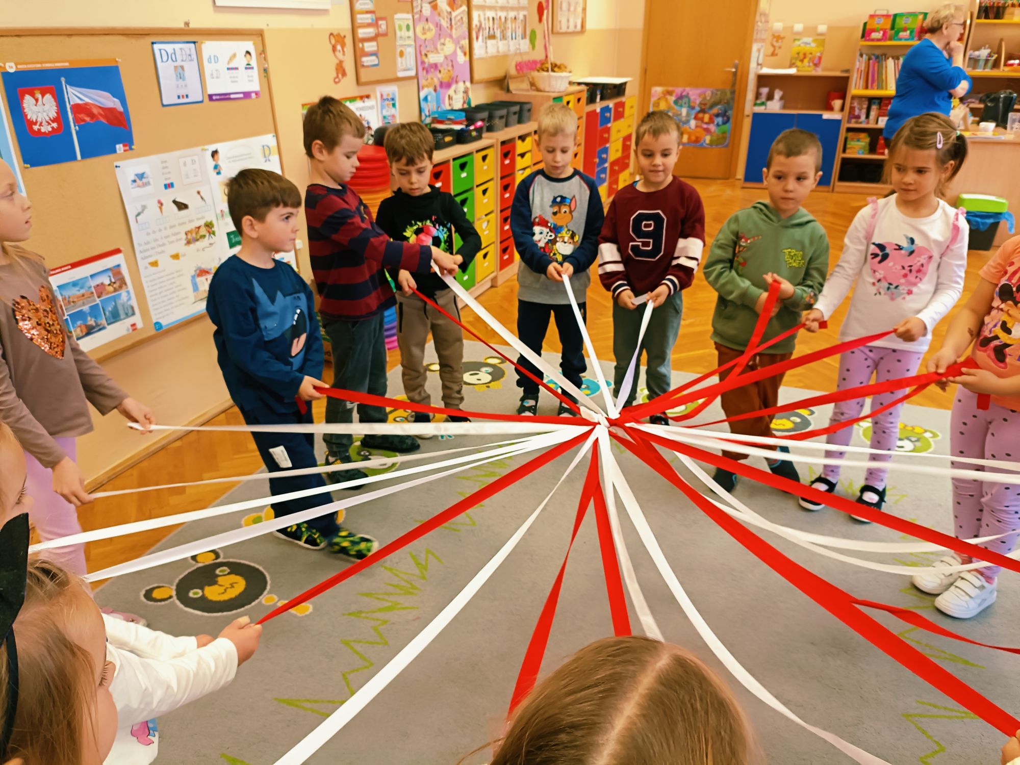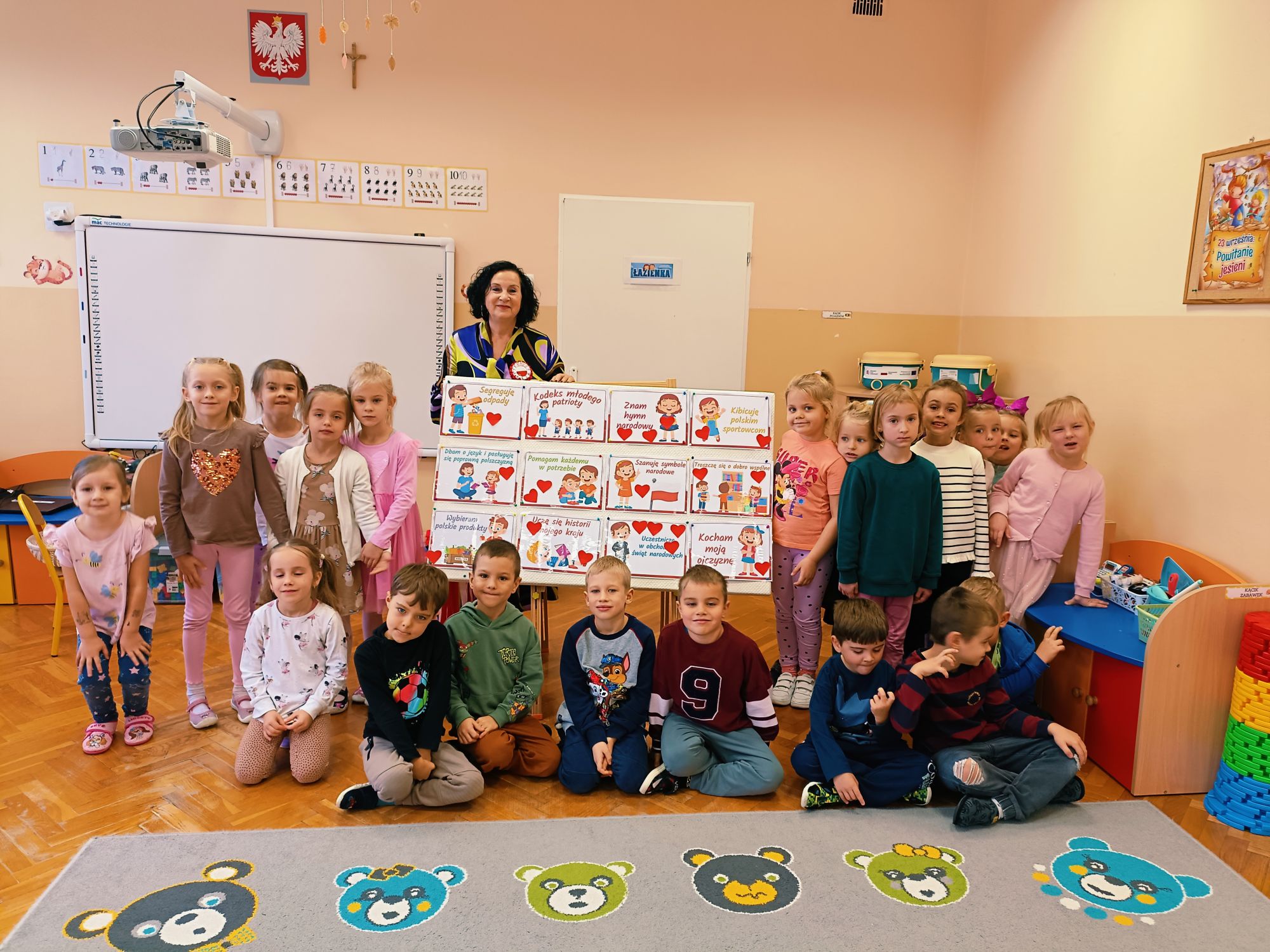 3 listopada 2025r.odwiedziła Przedszkole Publiczne Nr 1 w Ozimku , grupę Tygrysków pani Grażyna Świercz-bibliotekarka z Publicznej Szkoły Podstawowej Nr 1 w Ozimku.Za pomocą teatrzyku kamishibai przedstawiła dzieciom Legendę o powstaniu państwa polskiego –„O Lechu, Czechu i Rusie” Następnie zaprosiła przedszkolaki do quizu na temat państwa polskiego, tworzenia „Kodeksu małego patrioty” oraz odtańczenia fantazyjnego mazurka. Po zajęciach dzieci zostały nagrodzone słodkim upominkiem. Przedszkolaki wręczyły laurkę pani Grażynce w ramach podziękowań za kreatywne i bardzo pouczające zajęcia.