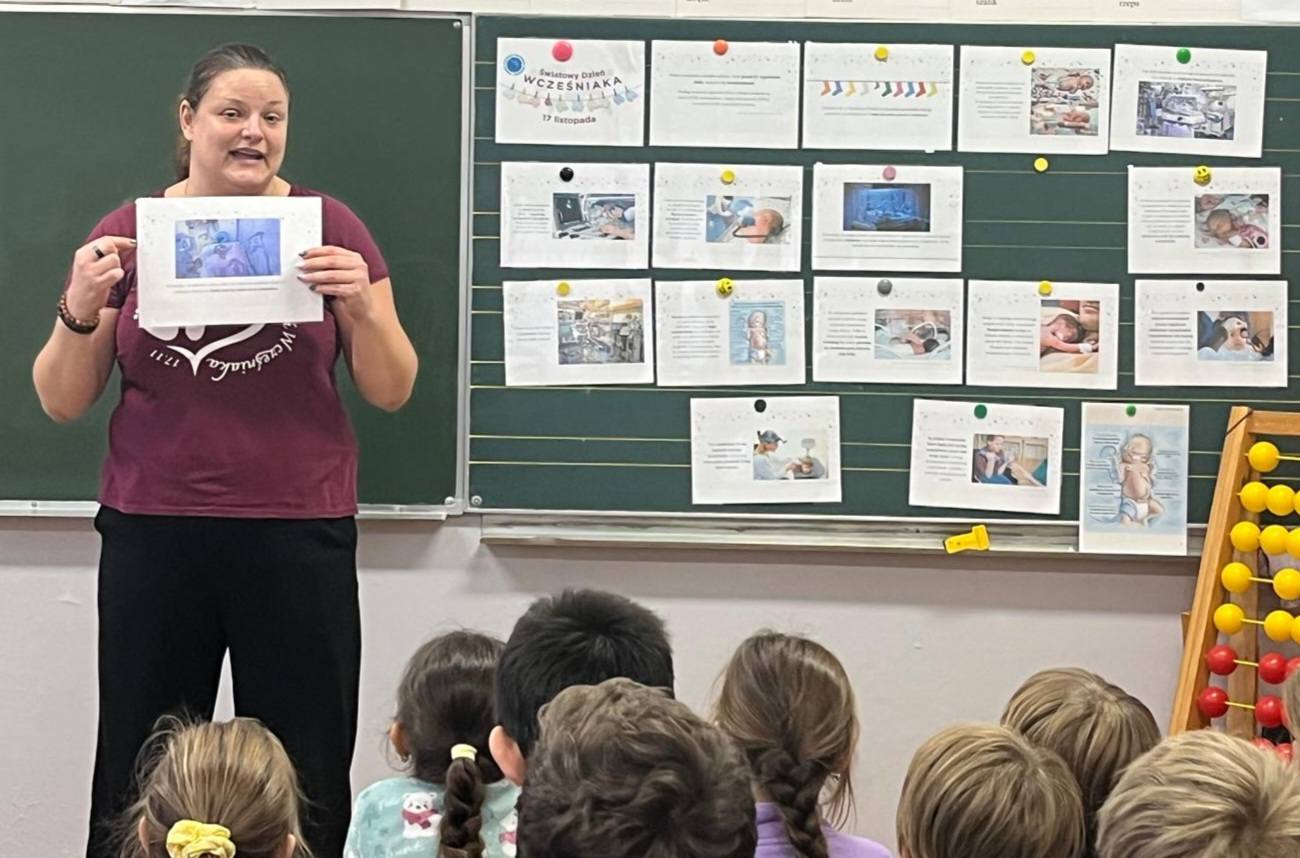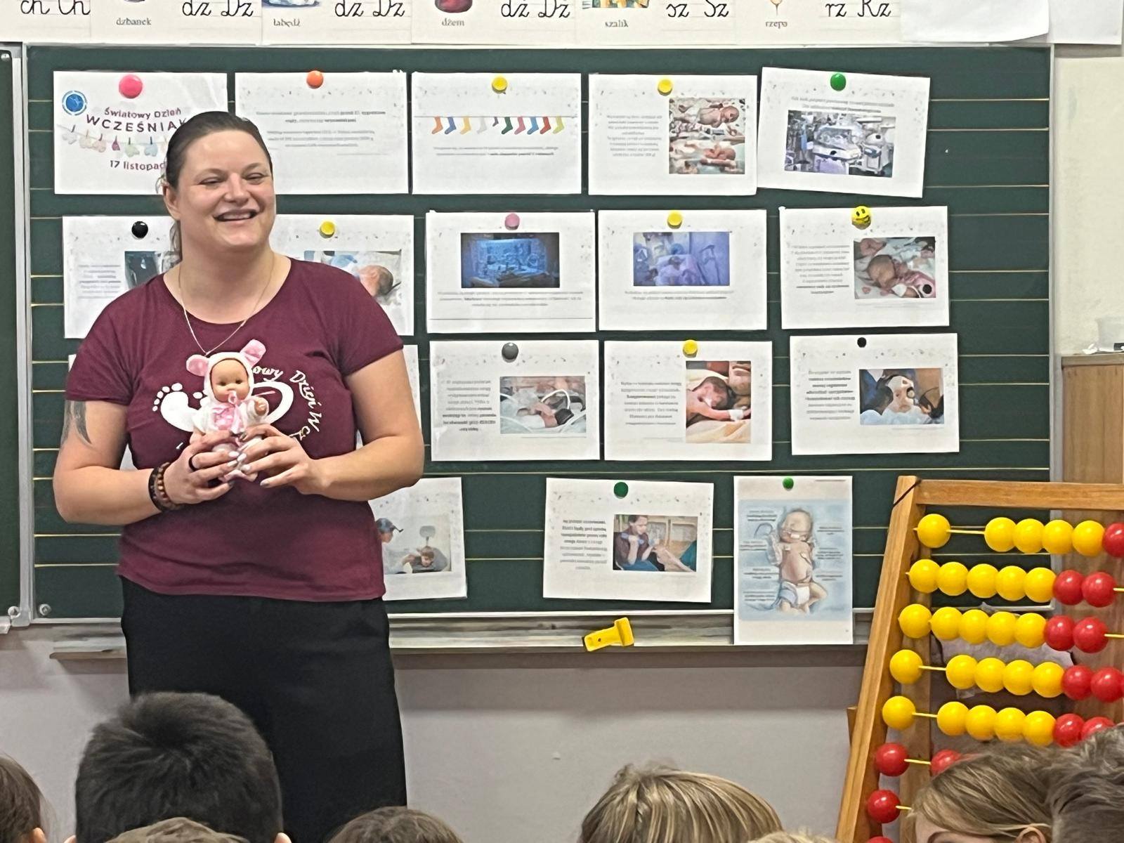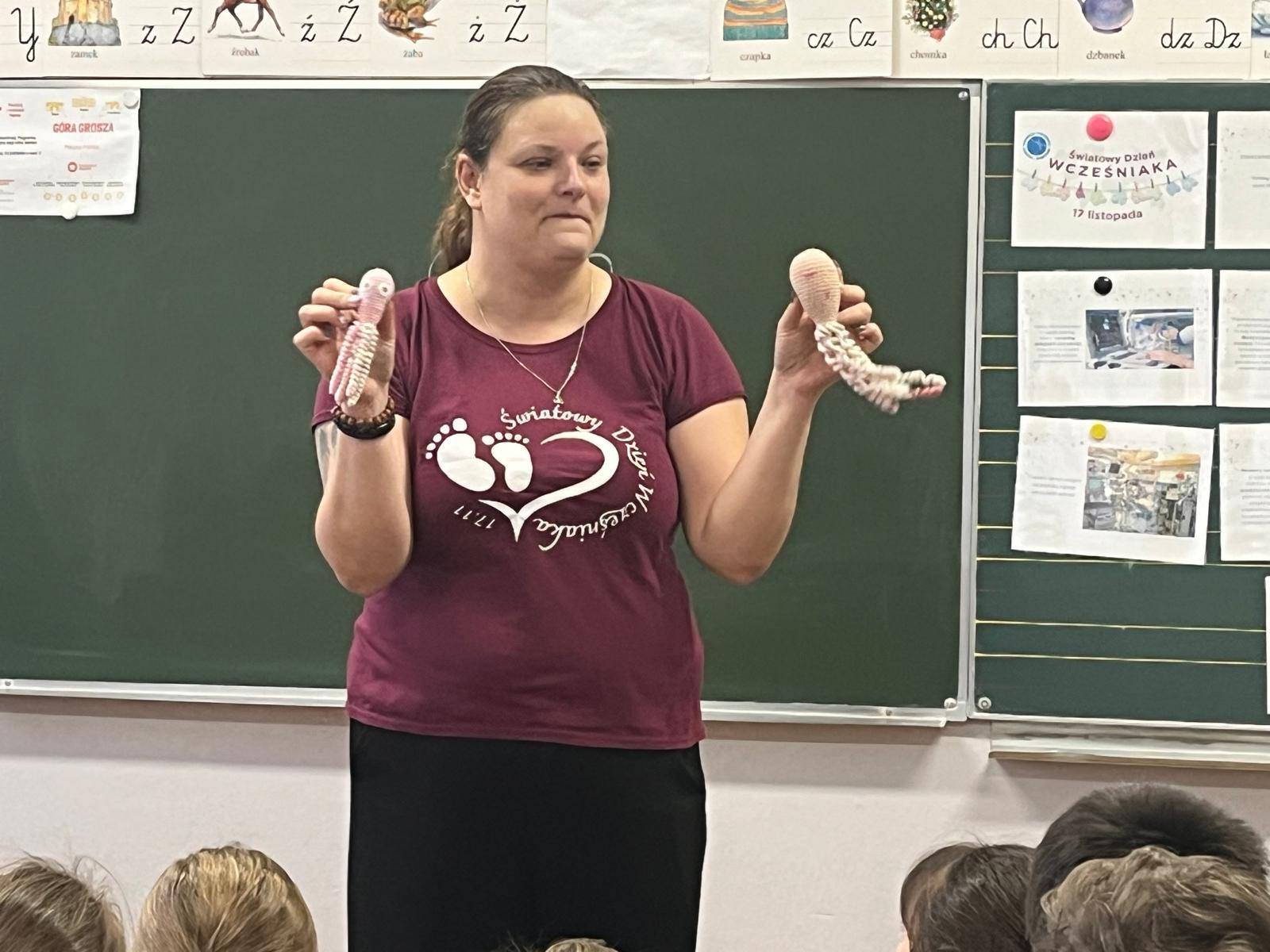Nasza szkoła ponownie włączyła się w ogólnopolską inicjatywę edukacyjno-zdrowotną Fundacji OliEdu – #fioletowelove, której celem jest szerzenie wiedzy o wcześniactwie oraz okazywanie wsparcia najmłodszym, wyjątkowo dzielnym bohaterom. Szkolnym koordynatorem akcji była pani Urszula Patoła. Fioletowy kolor to symbol siły i delikatności. Z okazji tego wyjątkowego dnia uczniowie naszej szkoły przyszli ubrani w fioletowe stroje, pokazując w ten sposób solidarność z Wcześniakami. Wykonali również piękne fioletowe serduszka, które stały się symbolem empatii, zrozumienia i wsparcia dla wszystkich wcześniaków oraz ich rodzin. Odbyło się spotkanie z wyjątkowym gościem. Mieliśmy zaszczyt gościć w naszej szkole panią Anetę Woźnicę, mamę dziewczynki urodzonej w 26. tygodniu ciąży, ważącej zaledwie 850 gramów. Nasz gość podzielił się niezwykle poruszającą historią walki o życie i zdrowie swojej córeczki, a także przybliżył uczniom, z jakimi trudnościami mierzą się wcześniaki. Pani Aneta udostępniła również prywatne zdjęcia z pierwszych dni życia dziecka, co sprawiło, że temat stał się dla uczniów jeszcze bardziej realny i wzruszający. Podczas zajęć przypomnieliśmy sobie również symbole towarzyszące wcześniakom na całym świecie: ośmiorniczka – daje maluszkom poczucie bezpieczeństwa, przypominając pępowinę; maleńkie skarpetki – ukazujące, jak drobne potrafią być wcześniaki; kolor fioletowy – symbol nadziei, wrażliwości i niezwykłej siły. Samorząd Uczniowski przygotował dla wcześniaków z naszej szkoły fioletowo-borówkowe galaretki, aby uczcić ich święto w miły, kolorowy i symboliczny sposób. To był dzień pełen wzruszeń, wiedzy i ogromnej dawki empatii. Dziękujemy wszystkim uczniom, nauczycielom i rodzicom za zaangażowanie oraz szerzenie świadomości o potrzebach wcześniaków. Razem tworzymy fioletową falę wsparcia!