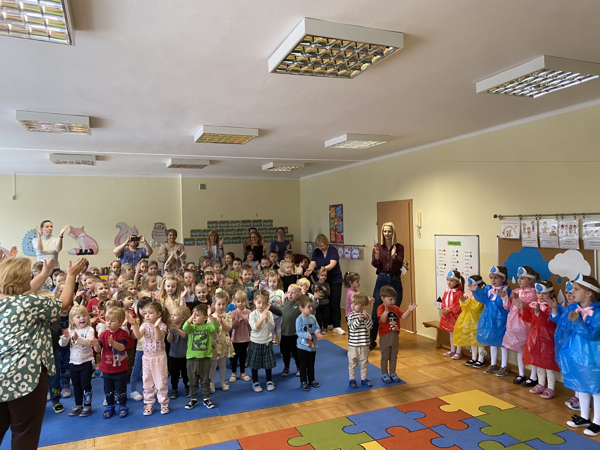 Spotkanie rozpoczęło się od słuchania odgłosów jesiennego deszczu, co wprowadziło wszystkich w niezwykły, nastrojowy klimat. Następnie dzieci z wielkim zaangażowaniem zaprezentowały piosenkę o jesieni. Kolejnym punktem programu była inscenizacja „Deszczowy Król”, w której nasi mali aktorzy wcielili się w role jesiennych bohaterów, pokazując, jak jesienny deszcz może być nie tylko szary, ale także magiczny i pełen niespodzianek.