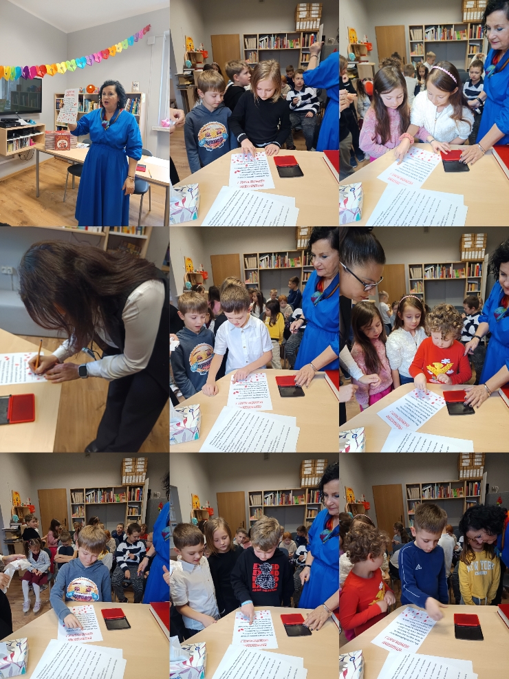 A żeby wszystko było naprawdę „na serio”, złożyli odcisk kciuka oraz zostawili miejsce na podpisy pani bibliotekarki i wychowawcy.