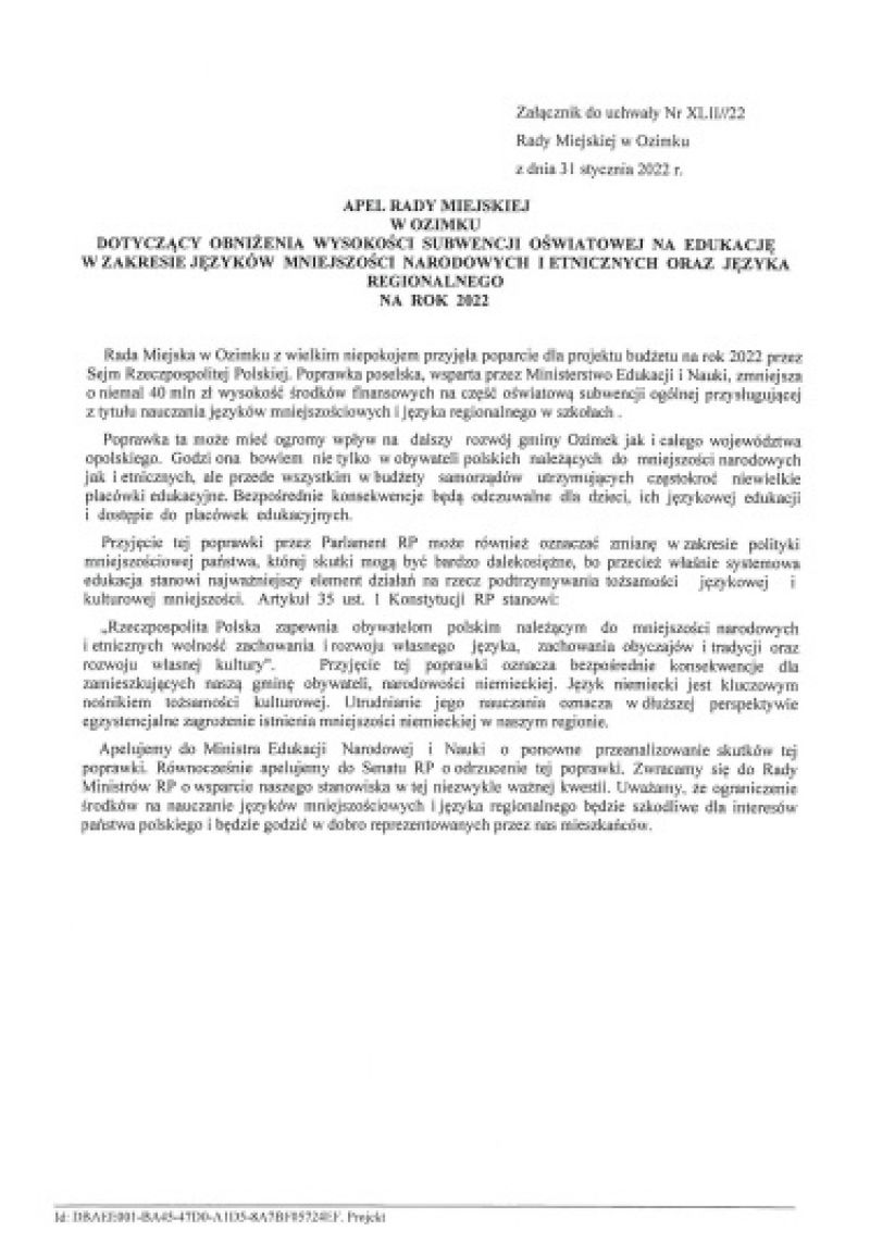 W związku z przyjęciem przez Sejm Rzeczypospolitej Polskiej projektu budżetu na rok 2022, zakładającego zmniejszenie niemal o 40 mln zł środków finansowych na część oświatową subwencji ogólnej, przysługującej z tytułu nauczania języków mniejszościowych i języka regionalnego w szkołach Burmistrz Ozimka Mirosław Wieszołek przygotował uchwałę stanowiącą apel do rządzących o skutkach dla Gminy Ozimek wynikających z obniżenia wysokości oświatowej na edukację w zakresie języków mniejszości narodowych i etnicznych oraz języka regionalnego. Projekt uchwały został jednogłośnie przyjęty przez Radę Miejską w Ozimku podczas sesji w dniu 31 stycznia 2022 roku.